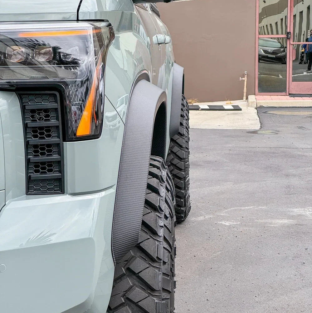 Upgrade your Toyota Tundra with the top-of-the-line Fender Flare Kit (2022-2025). At 2.5 inches wide, this kit offers enhanced safeguarding against dirt and rocks from larger off-road tires. Choose from durable fiber-reinforced plastic in a sleek black primer, or opt for a sophisticated carbon fiber finish in either gloss or matte. Easy to install without any drilling or trimming of OEM parts, these Fender Flares are held securely in place with 3M™ Super Strength Molding Tape and OEM bolts. Say goodbye to unsightly OEM fender flares and elevate your ride with Nytop's Fender Flare Kit.