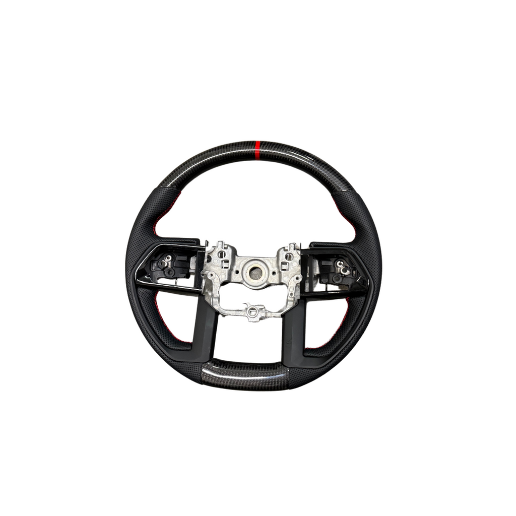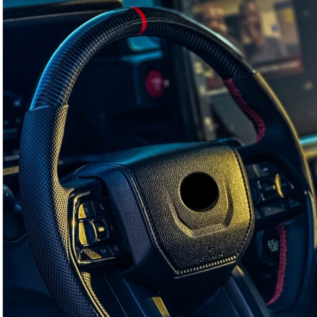 Upgrade the interior of your Tacoma 2024-2025/Tundra 22-24 with the new aspire auto accessories Carbon Fiber Steering wheel. No more fading and peeling like the OEM Tacoma steering wheel, ours is made with high quality materials. Equipped with carbon fiber, perforated leather, and a TRD red colored stripe and stitching. This steering wheel upgrade brings in proper ergonomics and luxury feeling that the OEM steering wheel simply does not have. You spend hours behind the wheel driving your car, might as well make driving feel good! The new steering wheel is based off of OEM steering wheel cores. So no matter the year, the buttons you have, we can make a wheel for you. The steering wheel features beefier hand grips at 9 and 3 positions giving you proper driving ergonomics. Because these are made off a factory steering wheel core, you retain your original buttons and trim along with reusing your airbag. This is not a simple cover but a re-engineered steering wheel!