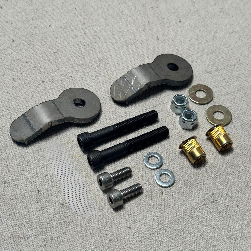 INSTALLATION NOTES: The bottom spring holder utilizes a threaded rivet nut (pictured) to capture the m8 bolts. Rivet nut tool will be required seperatly to install. Hole on bottom spring perch must be drilled out to 17/32. Factory spring isolator is then bolted to upper pocket with provided hardware. You must have the factory isolator to utilize this product.