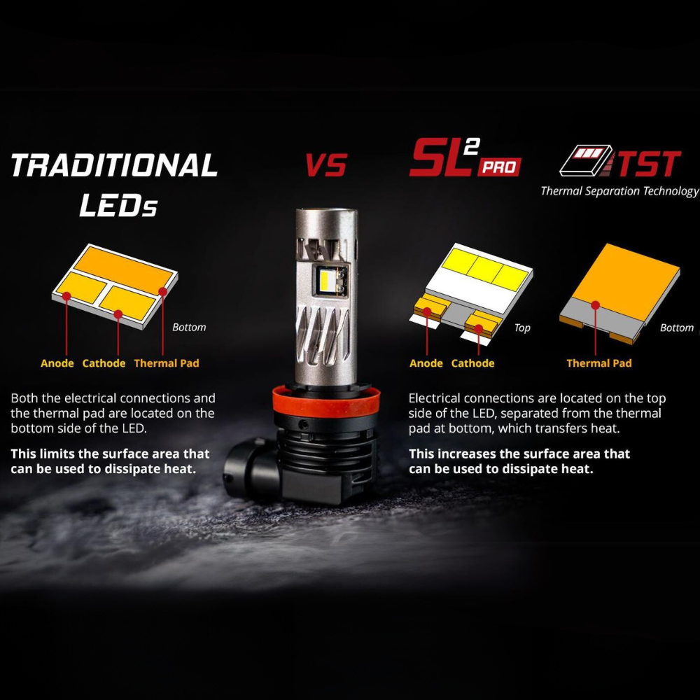 Next-Generation TST Technology. The SL2 Pro features new thermal separation technology (TST) LEDs. Unlike a traditional LED chip, TST LEDs are designed with electrical connections on the top. This means the entire bottom surface of the LED can be dedicated to channeling thermal energy out and away from the LED. This lowers thermal resistance, allowing the SL2 Pro to run at higher power levels than traditional LED bulbs, while maintaining focus.