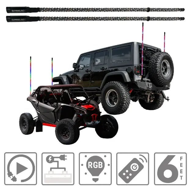 RGB LED Whip Lights are a great option for your ATV/UTV, RZR, Jeep, quad, dune buggy & more! Each kit comes with everything you need and even includes a wireless RGB remote to control the color changing LEDs. Hook these up to your turning signals, reverse lights and brake lights to lead the way on those dusty trails. From solid color to flashing patterns, with 366 modes to choose from, the color possibilities are endless!