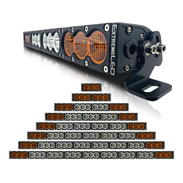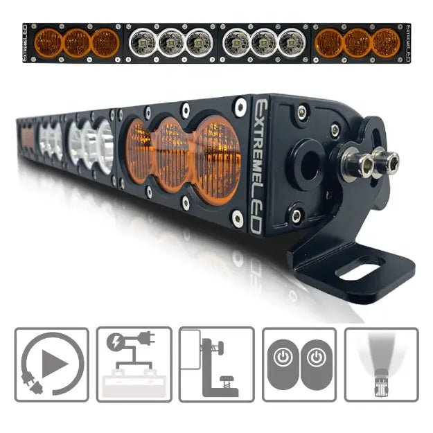 The Extreme LED X6 Series Amber and White LED Light Bars are a top choice for off-road enthusiasts looking for versatile lighting solutions. These light bars provide an ideal combination of amber and white lighting, making them perfect for all conditions. The white lights offer long-distance illumination, while the amber lights cut through dust, fog, snow, and rain, minimizing reflection for better visibility. The light bars feature 3 x 10-watt CREE LEDs per section (30 watts per section), providing powerful and reliable performance.