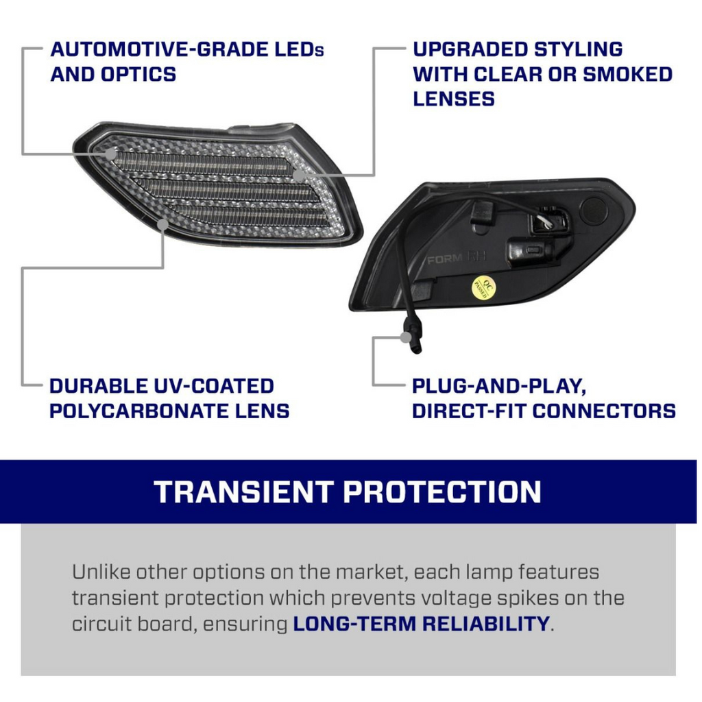 Upgraded Styling.These Form Lighting sidemarkers illuminate brighter than the factory units with full-strips of LED chips. They are available in both a smoked stealth option, or a clear lens that gives your sidemarker a sleek, wrap-around appearance.
