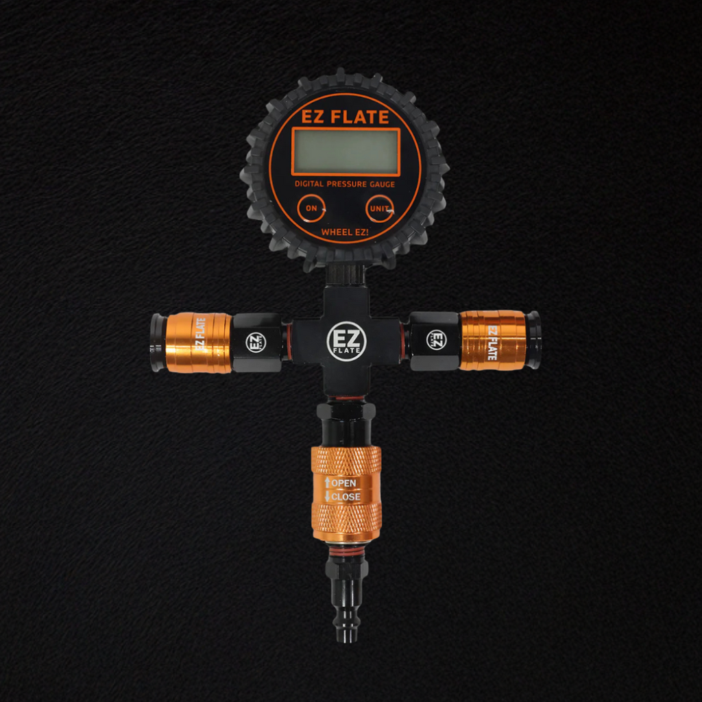 New EZ Flate Hyperflex 4-Way Hose System with Standard Manifold! Quick and convenient setup with caps for protection, Velcro straps for organization, and versatile length. Includes pressure gauge, coupler plug, and durable hybrid polymer hose.