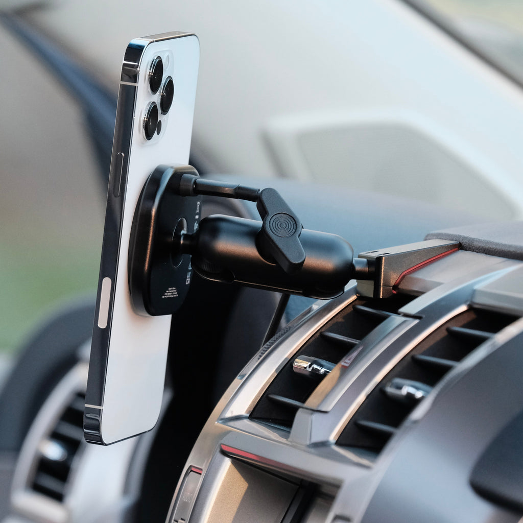 Unlike generic mounts that rely on suction cups or adhesives, this Offroam system uses a vehicle-specific aluminum mounting base that installs into the factory dashboard seams with no drilling required. The MagSafe-compatible magnetic holder allows you to instantly snap your phone into place while powerful magnets keep it stable—even on rough trails or uneven roads.