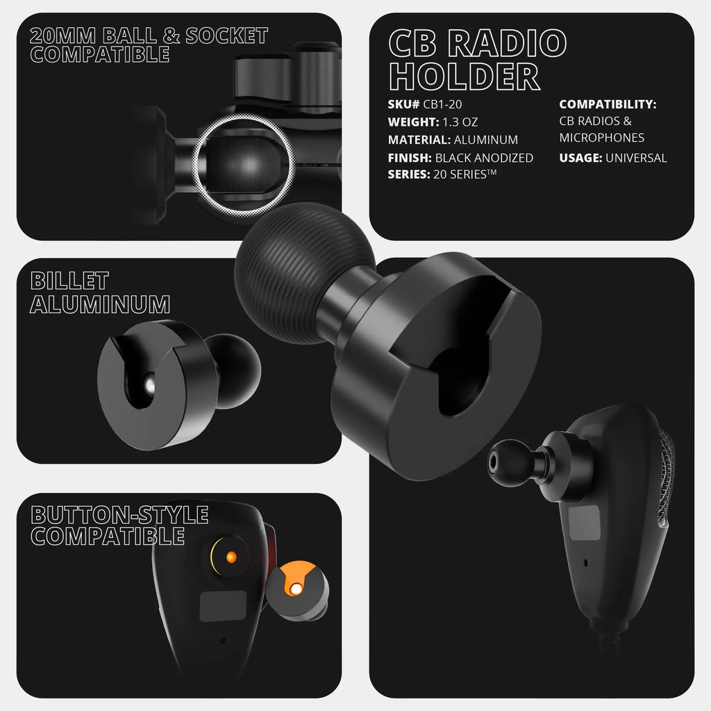 Our universal CB radio microphone holder is compatible with most popular brands that use a standard 'button-style' rear attachment. Crafted from billet aluminum, the holder features a 20mm ball that utilizes our Type-B interface. This interface allows for easy switching between different ball sizes (17mm, 25.4mm, and 26mm balls sold separately), enabling seamless integration with various ball-and-socket systems of your choice.