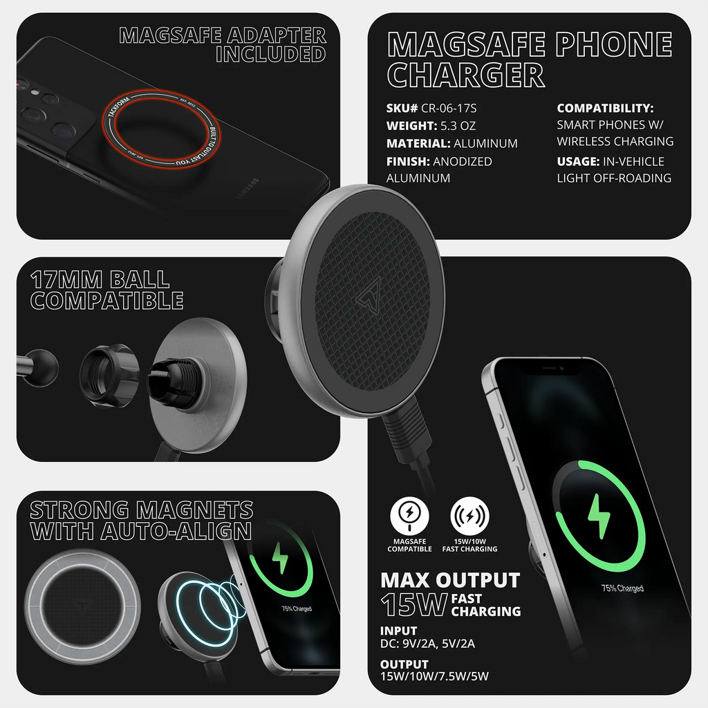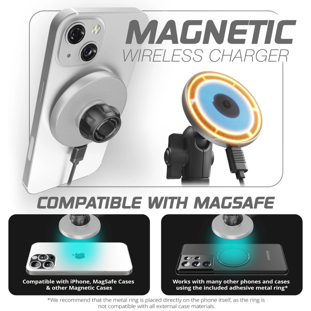 Whether you have the latest device or a phone case compatible with MagSafe, our newly designed wireless charging magnetic phone mount offers an ultra-secure, convenient attachment solution that is both no-slip and non-marring. For devices that aren’t compatible with MagSafe, we've included a sleek adhesive metal ring, allowing you to enjoy the same reliable magnetic hold with all the benefits of wireless charging.