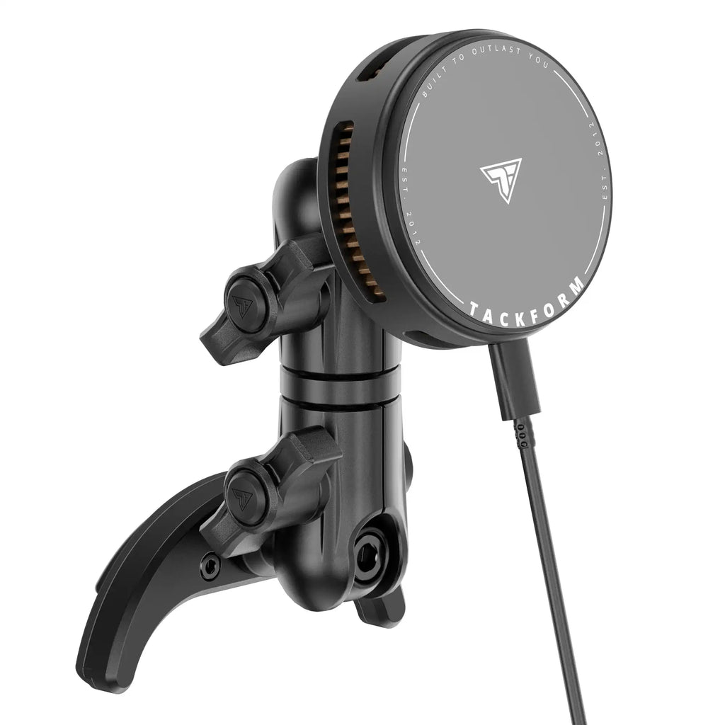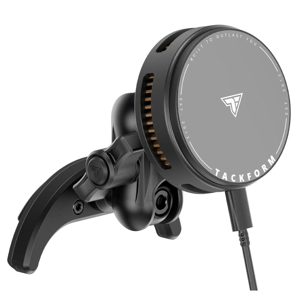 Our newest Qi2-compatible charger delivers a powerful blend of speed, efficiency, and thermal protection. Supporting MagSafe, Qi2, and Google Pixel (PixelSnap) devices, it provides up to 25W of high-speed wireless charging—backed by an included high-power car charger to ensure maximum output. At the core of the system is our advanced TEC “ice” cooling module, which actively regulates temperature to prevent overheating and maintain peak performance during demanding use. Paired with a precision-machined CNC billet aluminum 20mm ball and a non-marring magnetic charging surface, this charger delivers a rock-solid magnetic hold and smooth adjustability. Built specifically for Tackform’s 20 Series Platform, it offers the durability, stability, and engineered load capacity you expect from over-engineered components. (Not compatible with 1" / 25.4mm B-size ball systems.)