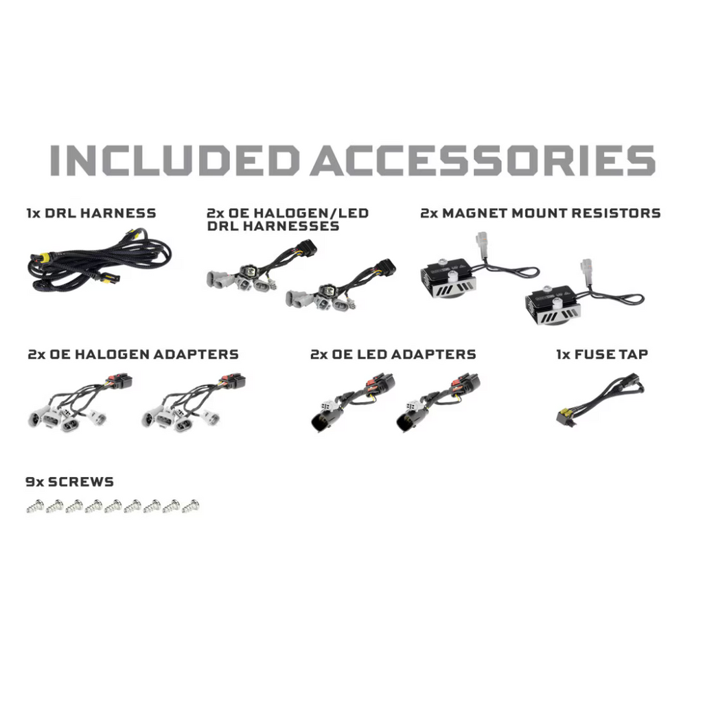 Wiring:2x Halogen Adapters, 2x LED Adapters, 2x Magnet Mount Resistors, 1x DRL Harness, 1x Fuse Tap, 9x Screws