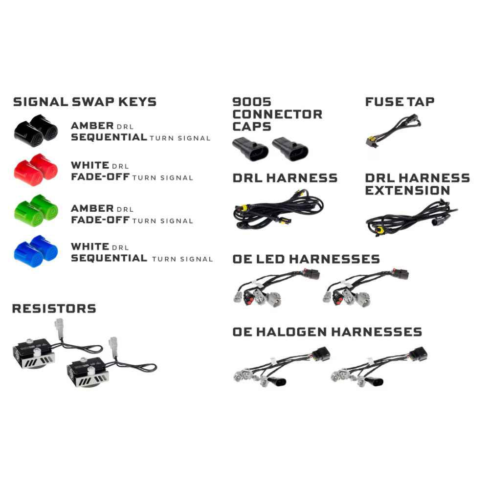 Wiring:2x Halogen Adapters, 2x LED Adapters, 2x Magnet Mount Resistors, 1x DRL Harness, 1x DRL Harness Extension, 1x Fuse Tap