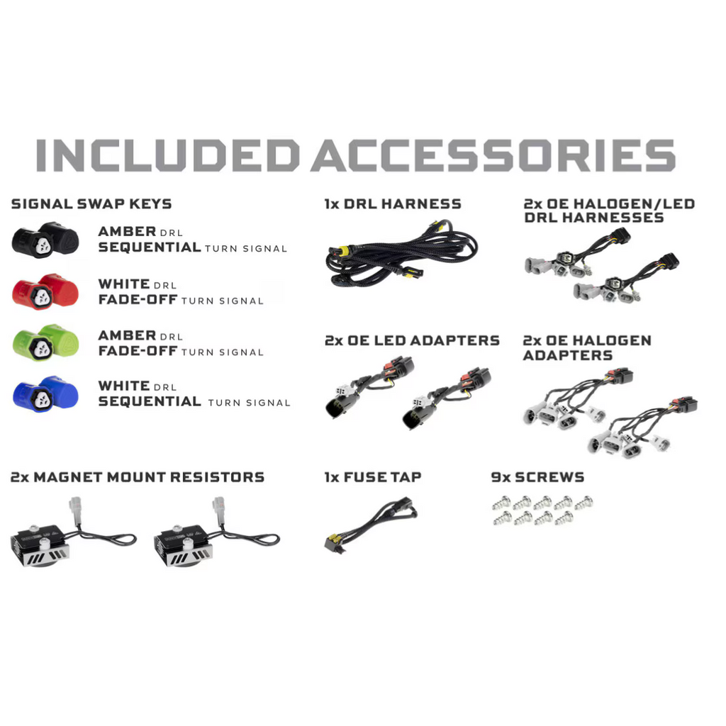 Wiring:2x Halogen Adapters, 2x LED Adapters, 2x Magnet Mount Resistors, 1x DRL Harness, 1x Fuse Tap, 9x Screws