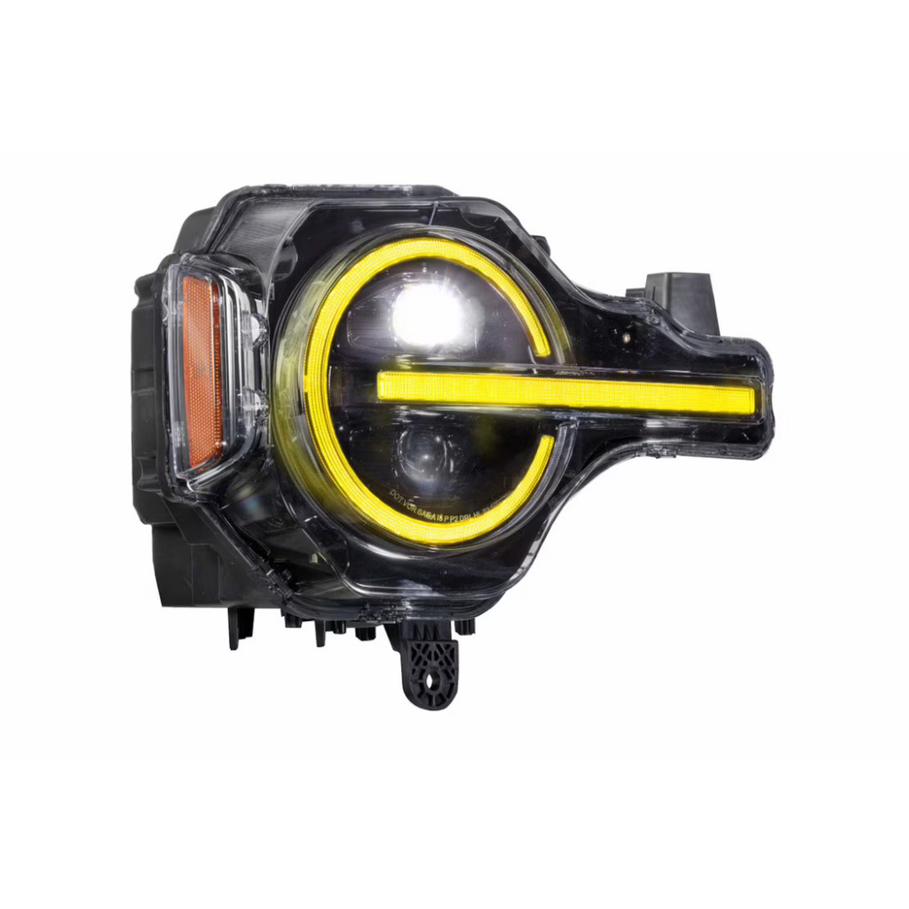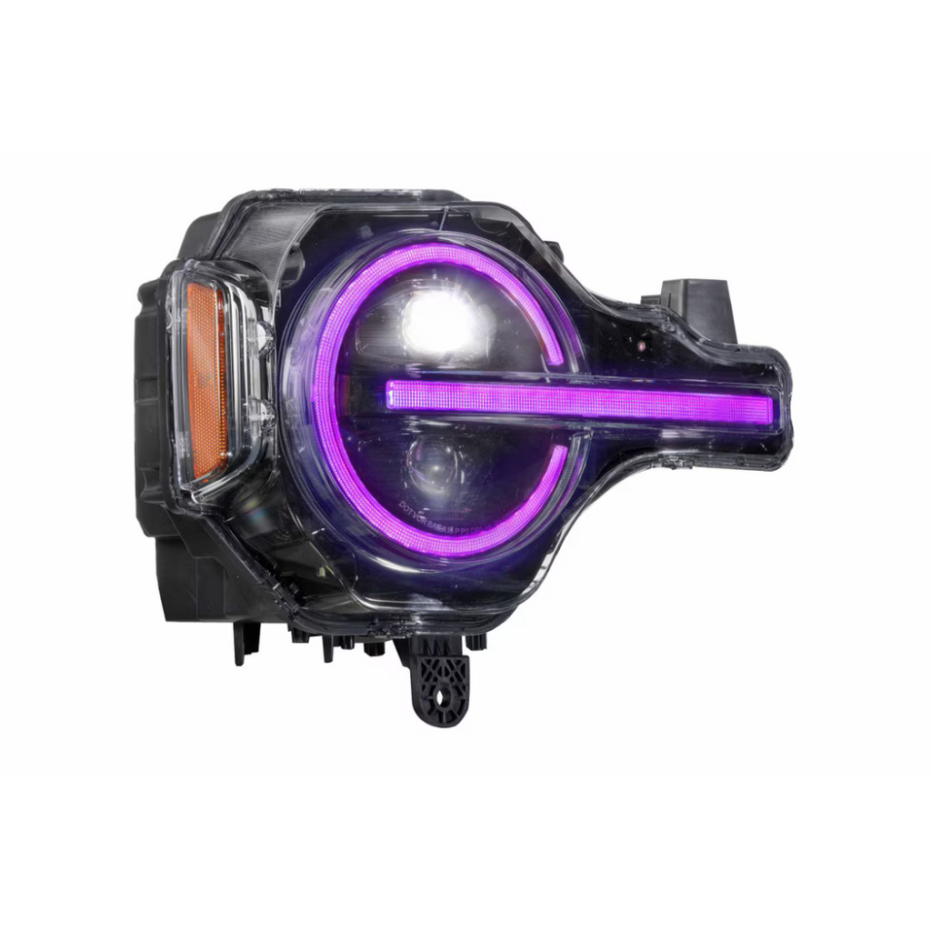 Introducing the XRGB headlights from Morimoto a game-changing solution for enhancing your new Bronco's lighting performance. These headlights are designed to address the common issue of poor LED headlight output in the stock Bronco. With high-output Bi-LED projectors, they provide 150% more intensity in low beam mode and 86% brighter high beams compared to stock headlights, resulting in superior road coverage. What sets the XRGB apart is its RGB Daytime Running Lights, which allow you to customize their color via a user-friendly Bluetooth app on your smartphone. While delivering impressive lighting performance, these headlights are also plug-and-play, seamlessly connecting to your Bronco's factory multi-pin connector without additional wiring. Plus, they won't void your factory warranty. Please note that while the XRGB headlights meet DOT/FVMSS108 guidelines for on-road illumination, their color-changing DRL may not be DOT approved for street use in all regions. Always follow local regulations when using them.