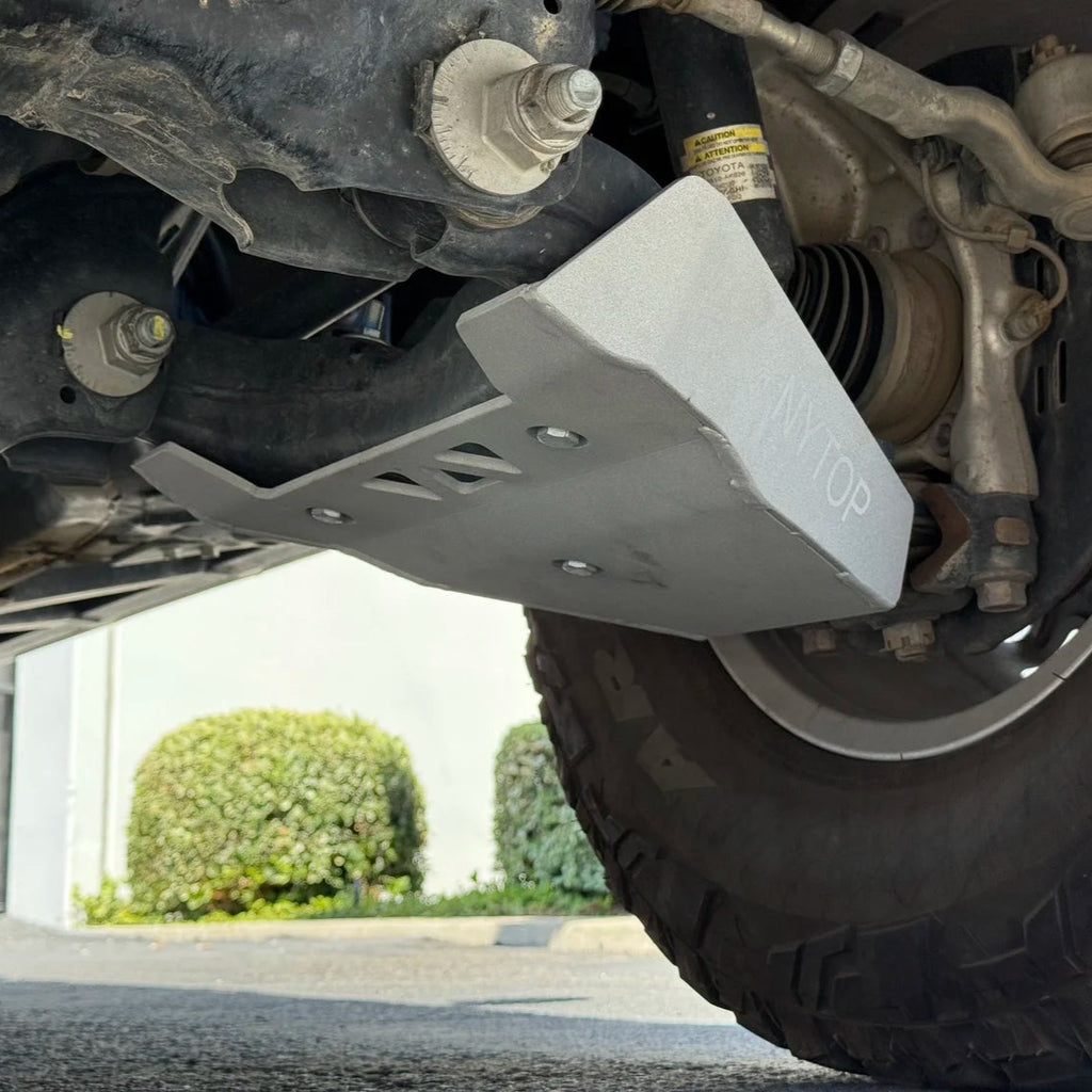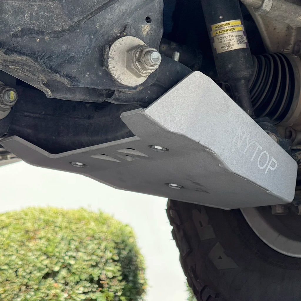 The Nytop Lower Control Arm Skid Plate Kit for Tacoma (2024-2026) is finished in TIG welded with 1/4 inch raw aluminum, providing protection to the OEM front lower control arms and the shock mounts, while also eliminating any potential wind noise caused by the open holes under the lower control arm after the removal of the air dams.