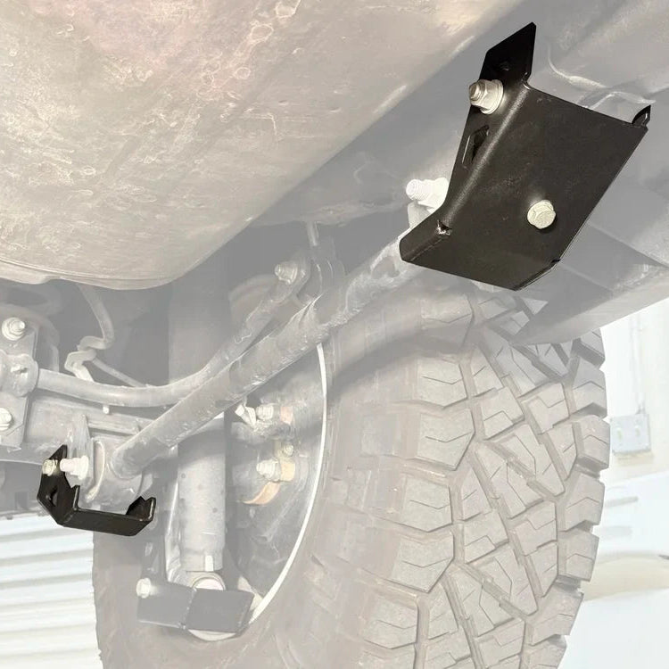 Nytop Toyota Tacoma Lower Trailing Arm Skid Plate Kit is finished in wrinkled black powder coat, and TIG welded with 3/16-inch high-strength steel to ensure durability, providing protection to the OEM lower trailing arm mounts.