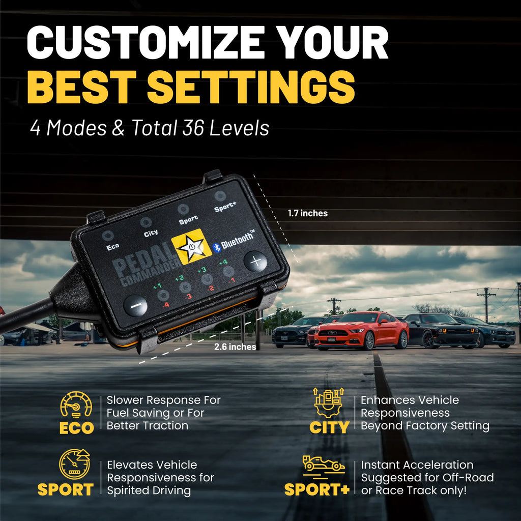 36 Adjustable Settings: Pedal Commander is equipped with four modes, Eco, City, Sport, and Sport +. Each mode has an additional nine drive modes to fine-tune to your liking, making this a must-have accessory for your TOYOTA TACOMA.
