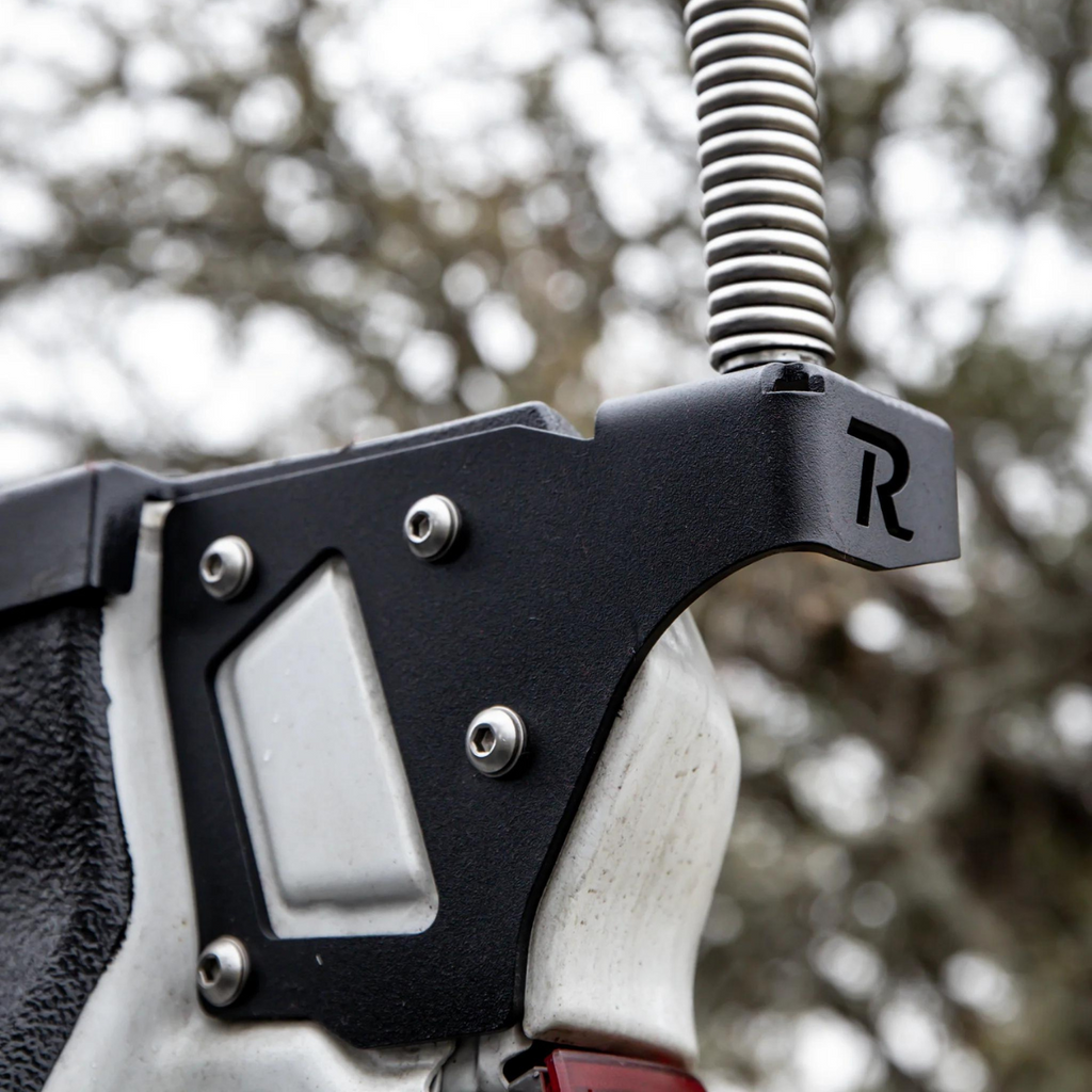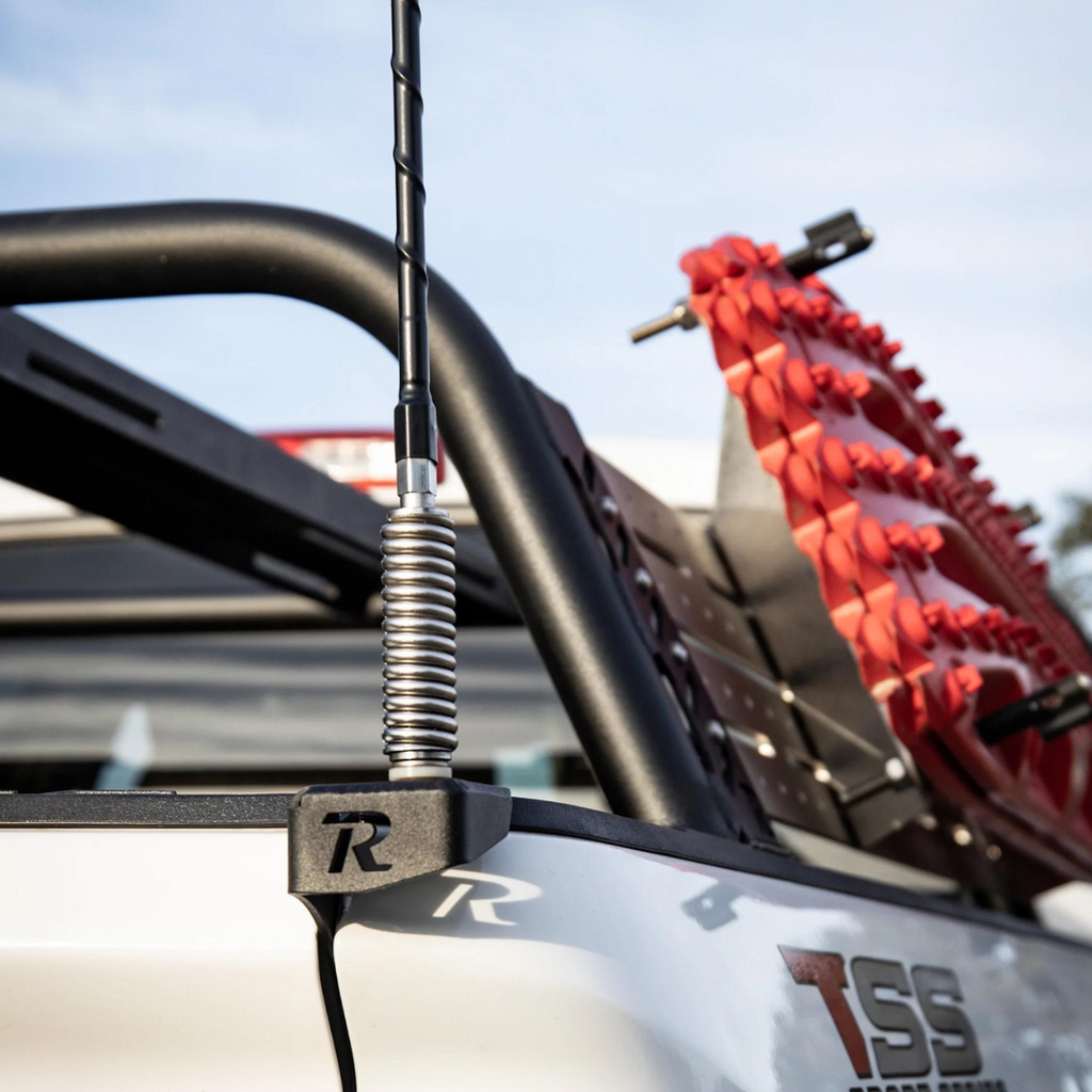 The antenna mount is CAD designed and tested by Rago Fabrication. Each mount is CNC cut and bent from 1/8" cold roll Stainless Steel then powder coated black for durability.