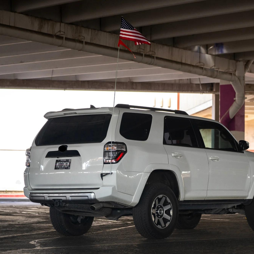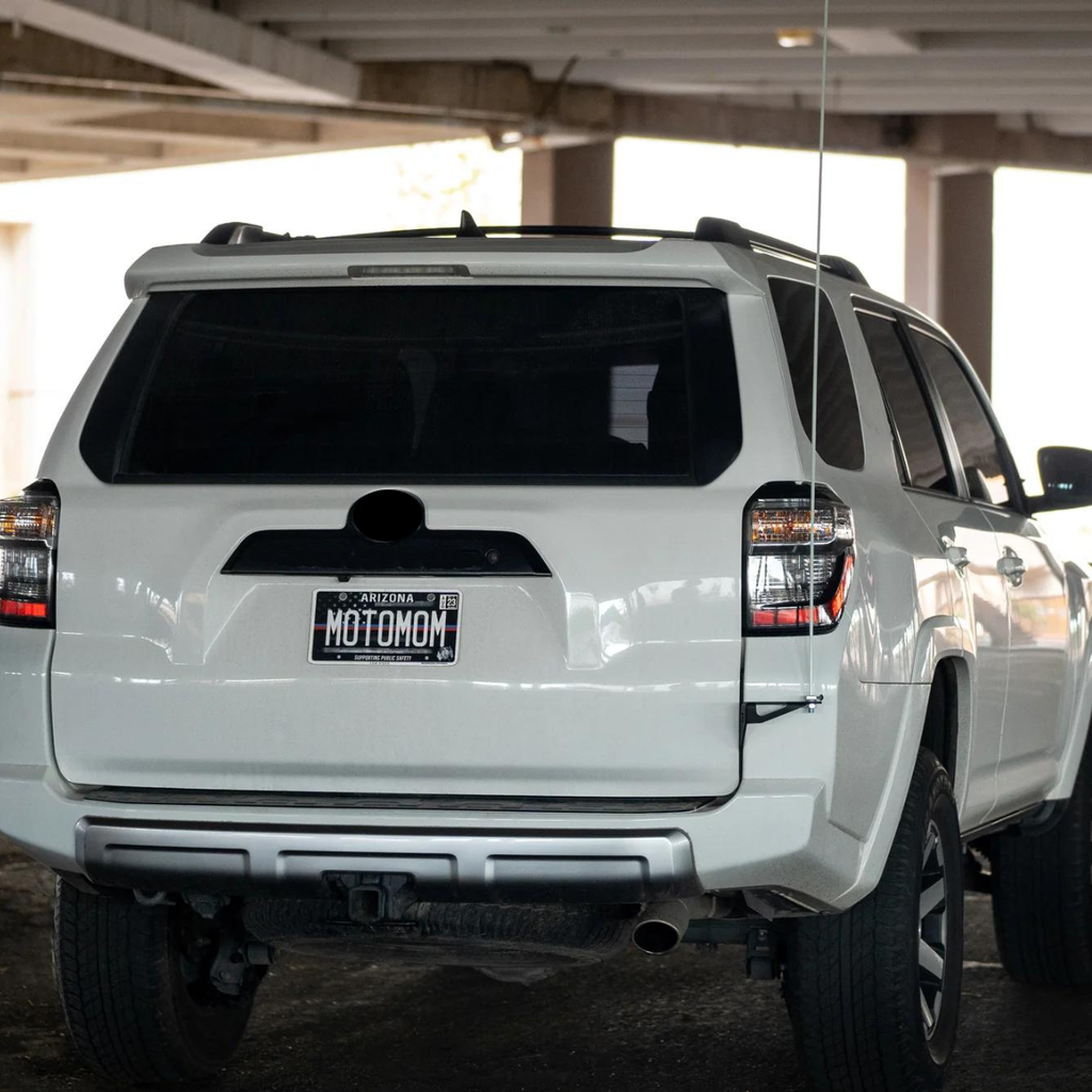 The Rago Fabrication CB Antenna Mount is a simple way to mount your CB Antenna at the rear end of a 2010-2023 5th Gen Toyota 4Runner using pre-installed rivet nuts and a support plate. In place of a CB antenna, a ATV/UTV sized whip flag can be installed for trails where it's required.