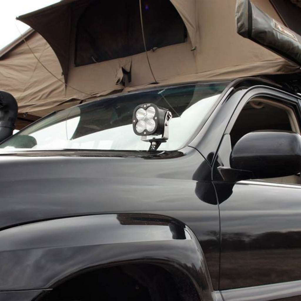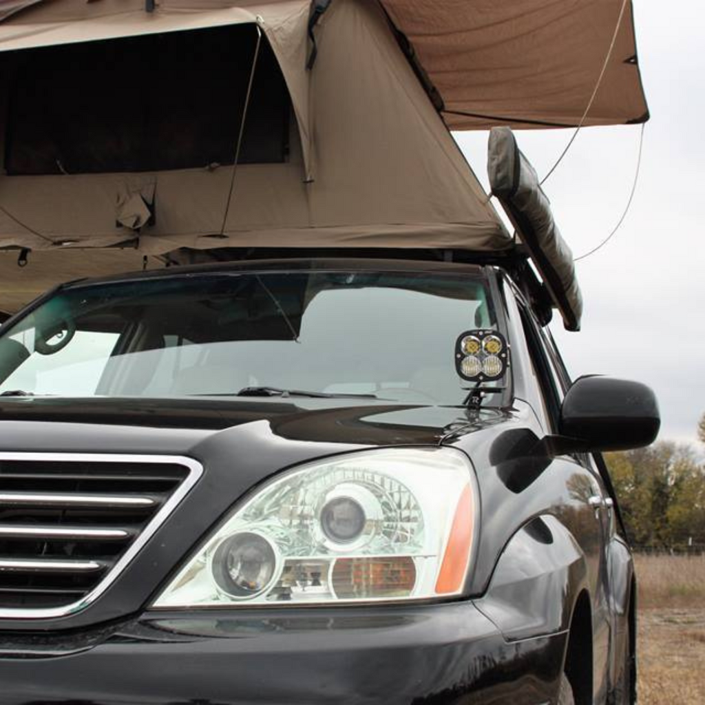 The Lexus GX 470 (2003-2009) Rago Fabrication Ditch Light Brackets give you the ability to run aftermarket LED light pods on the hood of your GX 470. They attach to the hood hinge bracket with minimal trimming and no drilling necessary.
