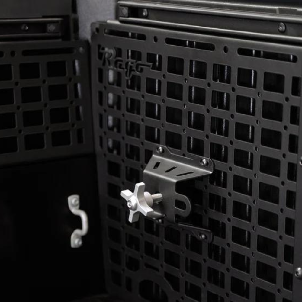 The Universal Hi-Lift Jack Mounts were designed for versatile mounting options for a Hi-Lift style jack. The includedstainless steelhardware can be used to mount these on molle panels, truck beds, trailers, garage wall, etc. They were designed to seamlessly fit Rago Fabrication molle panels, but fitment has also been confirmed for ADD Offroad & DV8 Offroad molle panel systems. Constructed from ⅛-inch American steel, they are then sandblasted and finished in a durable 2-stage hammer black powder coat. Installation is a bolt-onprocess, butmay require drilling depending on your application. All Rago products are proudly made in the USA.