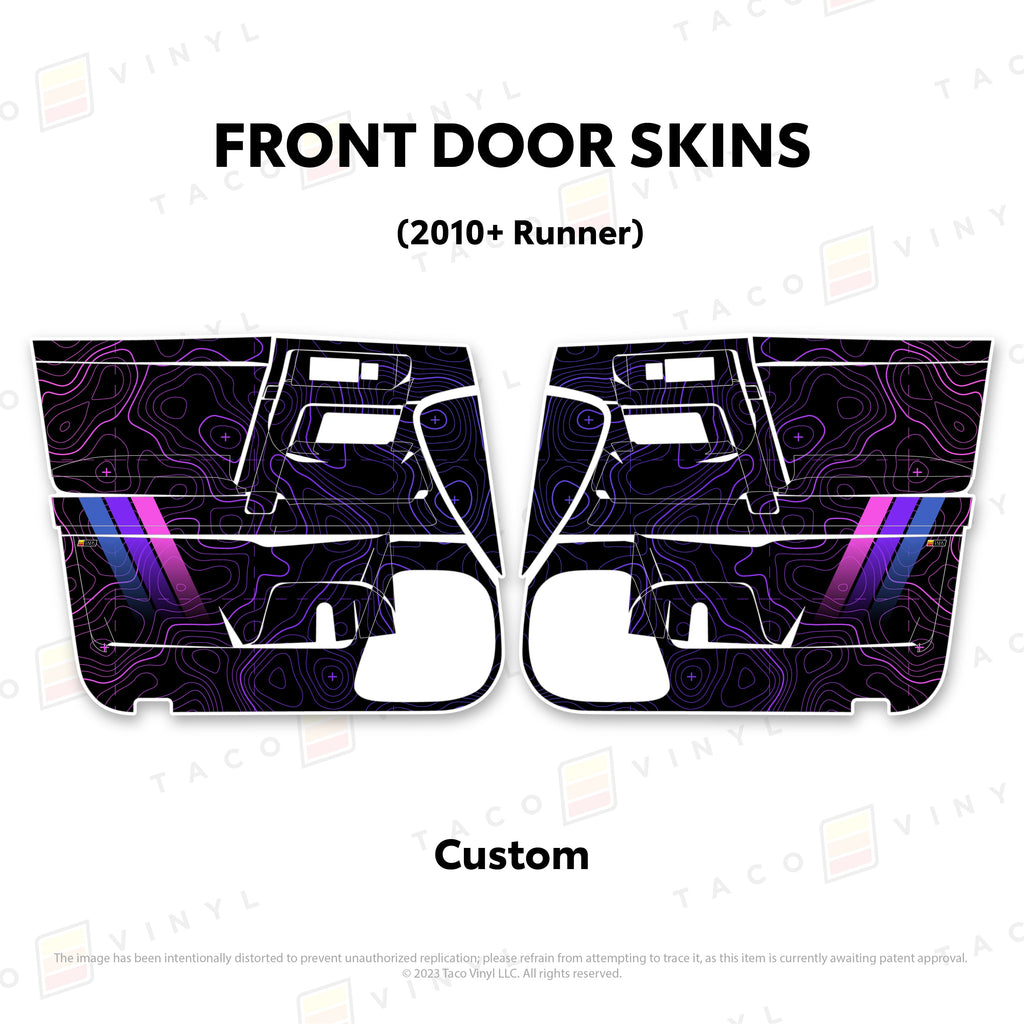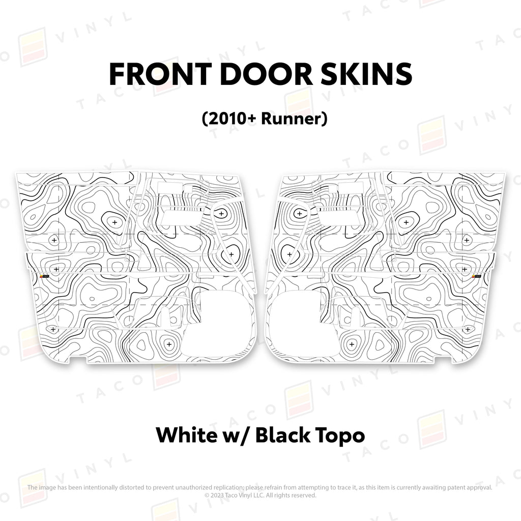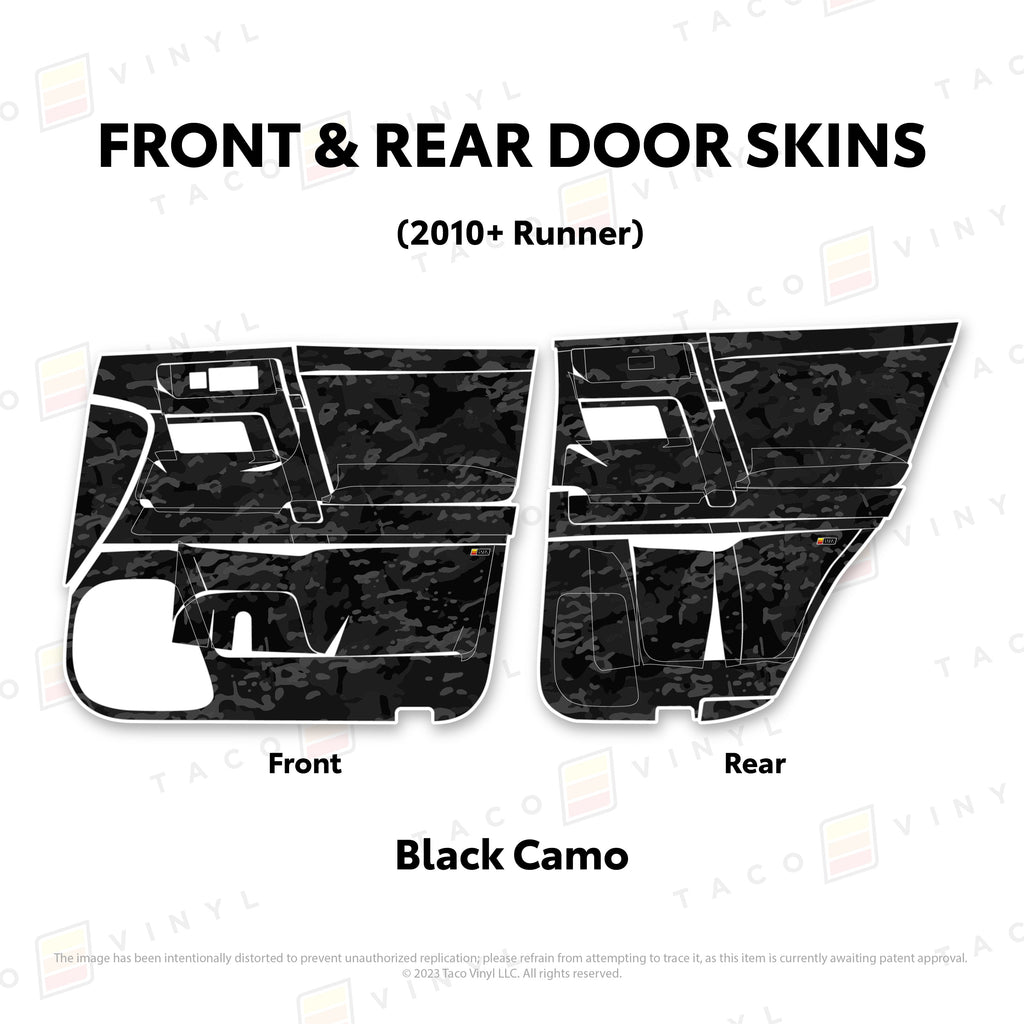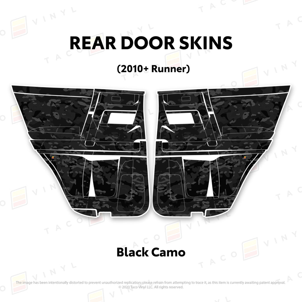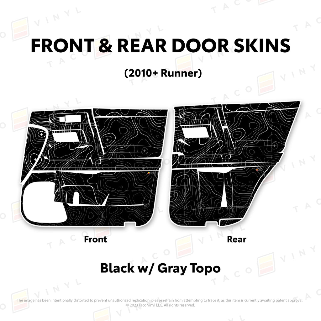 Welcome the worlds first door skins for your 5th Gen 4Runner. Taco Vinyl Door Skins for 4Runner (2010-2024) are made of the best and thickest material to get the job done. Taco Vinyl made these at first to protect against door wear and tear from your boots, tools, pets and recreational activities then discovered that they are also aesthetically appealing. Whether you plan to keep your truck forever or have it on lease, Taco Vinyl door skins will keep the door panel in great condition while also adding a cool design if you choose. Plus, the 4Runner design provides 20% more coverage than the Tacoma.