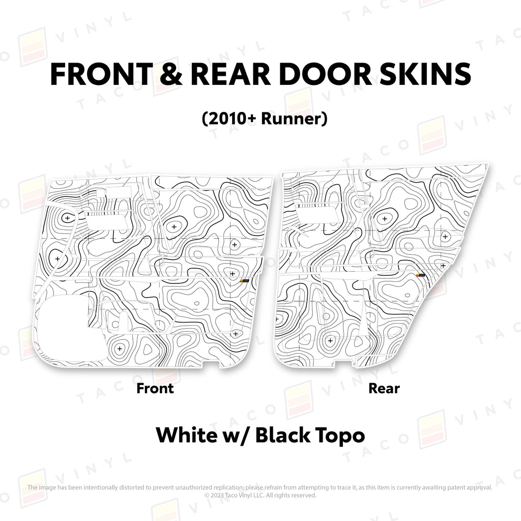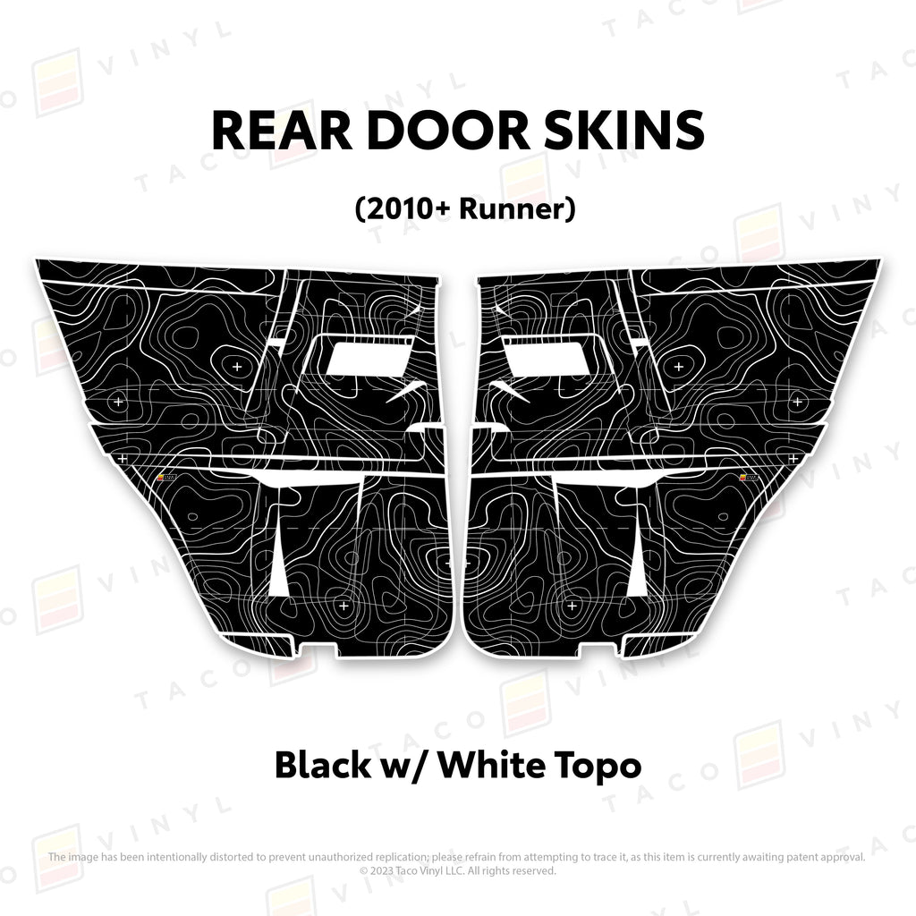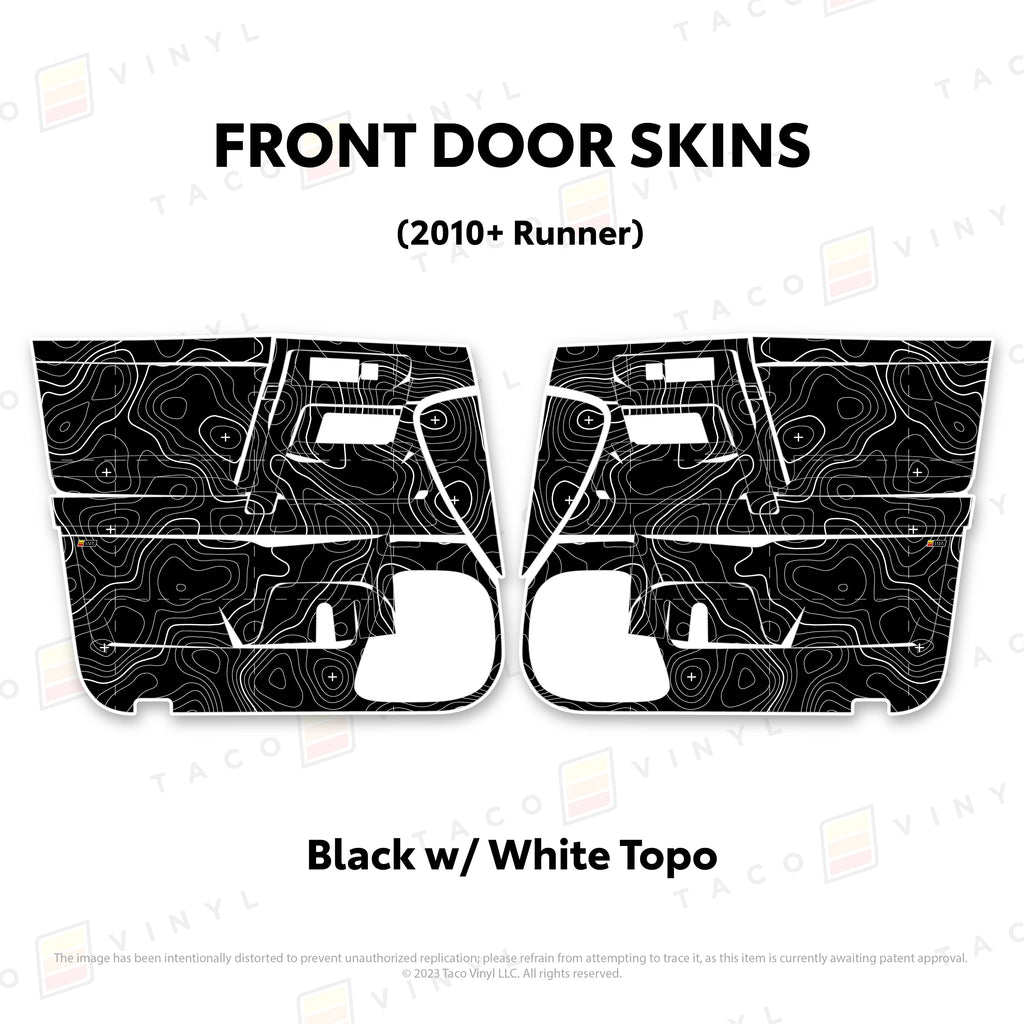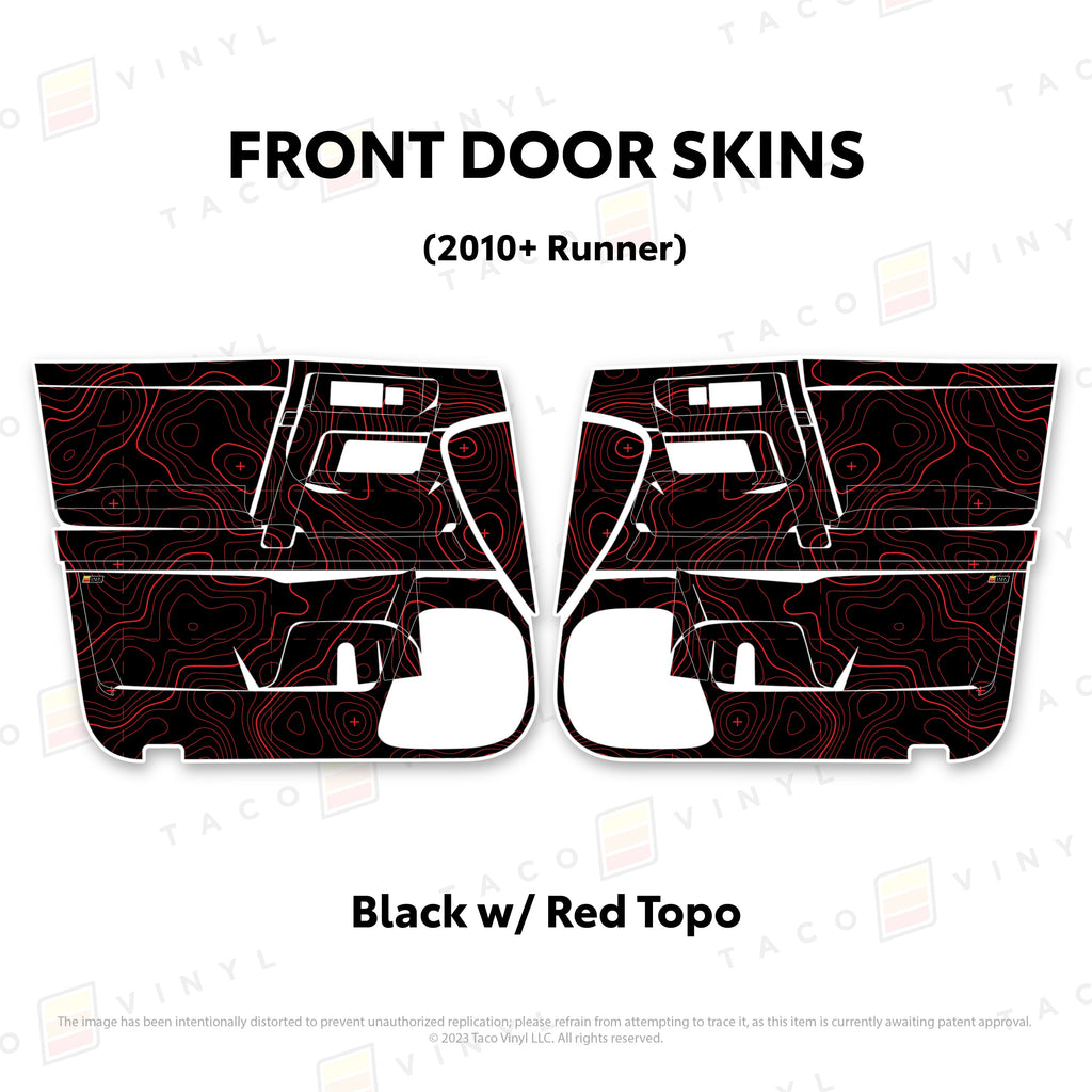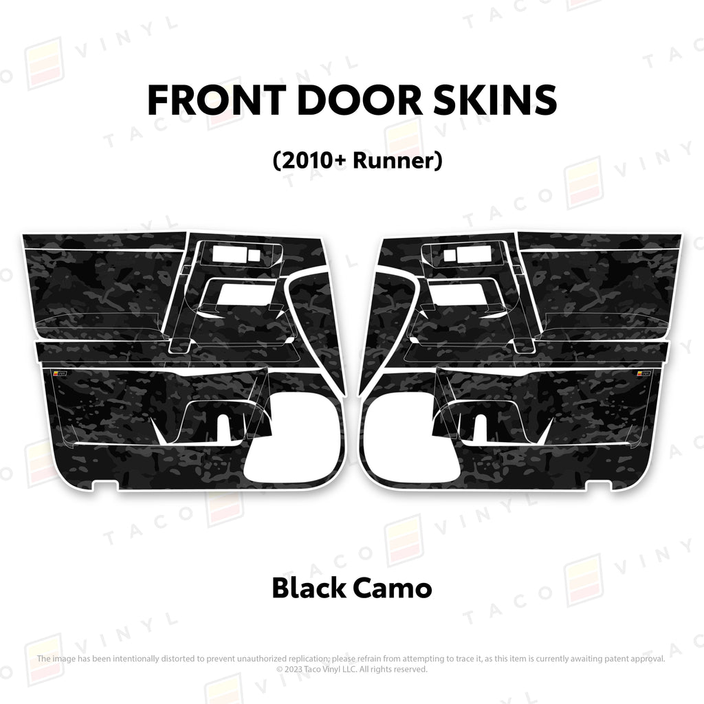 Welcome the worlds first door skins for your 5th Gen 4Runner. Taco Vinyl Door Skins for 4Runner (2010-2024) are made of the best and thickest material to get the job done. Taco Vinyl made these at first to protect against door wear and tear from your boots, tools, pets and recreational activities then discovered that they are also aesthetically appealing. Whether you plan to keep your truck forever or have it on lease, Taco Vinyl door skins will keep the door panel in great condition while also adding a cool design if you choose. Plus, the 4Runner design provides 20% more coverage than the Tacoma.