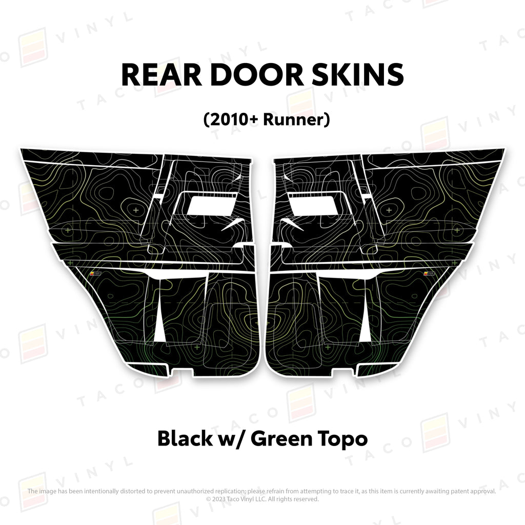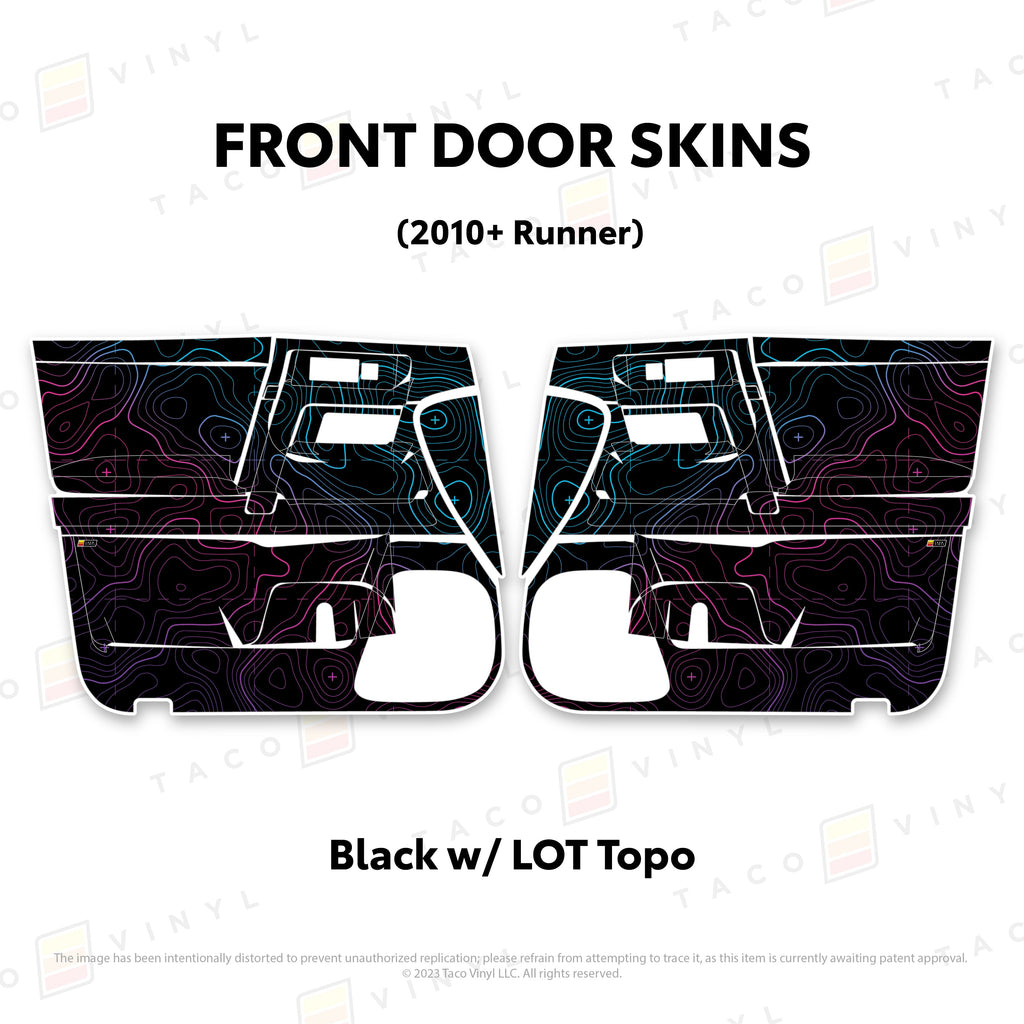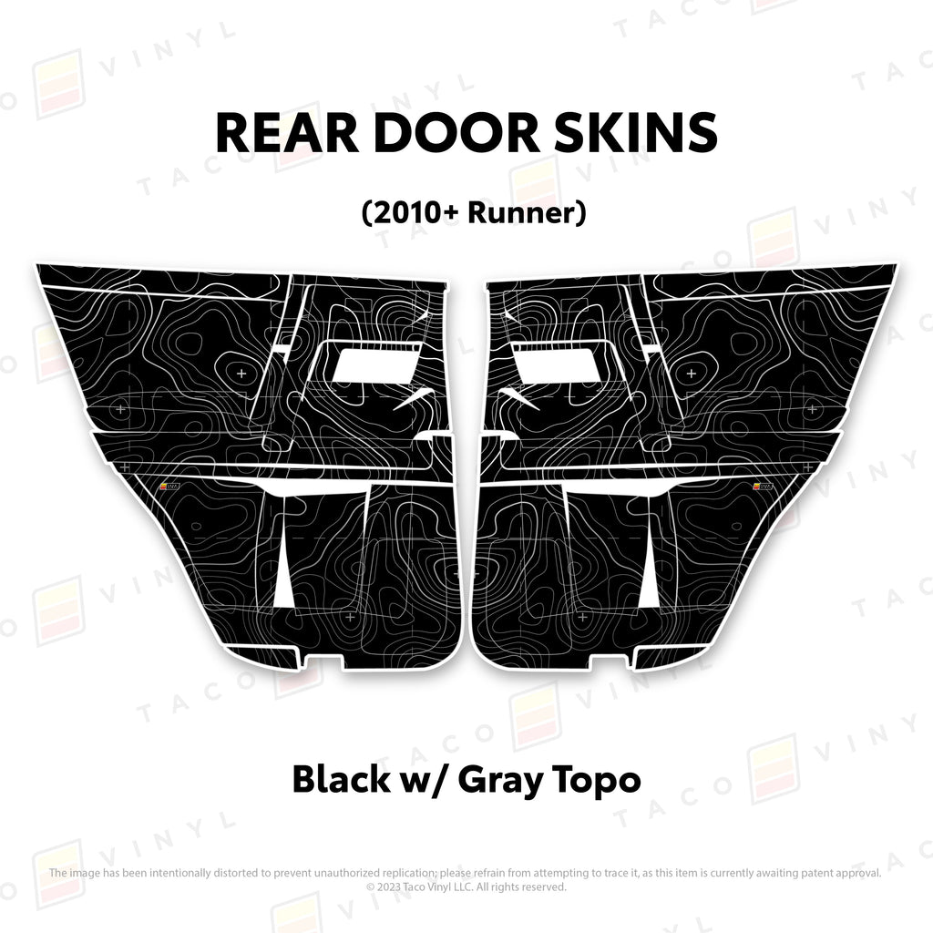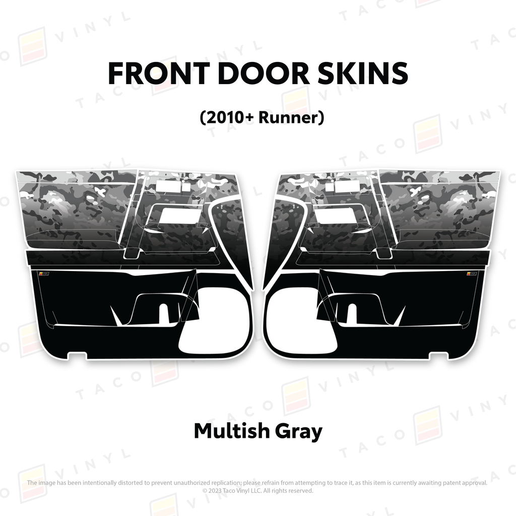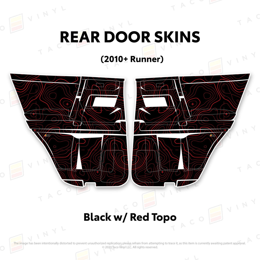 Welcome the worlds first door skins for your 5th Gen 4Runner. Taco Vinyl Door Skins for 4Runner (2010-2024) are made of the best and thickest material to get the job done. Taco Vinyl made these at first to protect against door wear and tear from your boots, tools, pets and recreational activities then discovered that they are also aesthetically appealing. Whether you plan to keep your truck forever or have it on lease, Taco Vinyl door skins will keep the door panel in great condition while also adding a cool design if you choose. Plus, the 4Runner design provides 20% more coverage than the Tacoma.