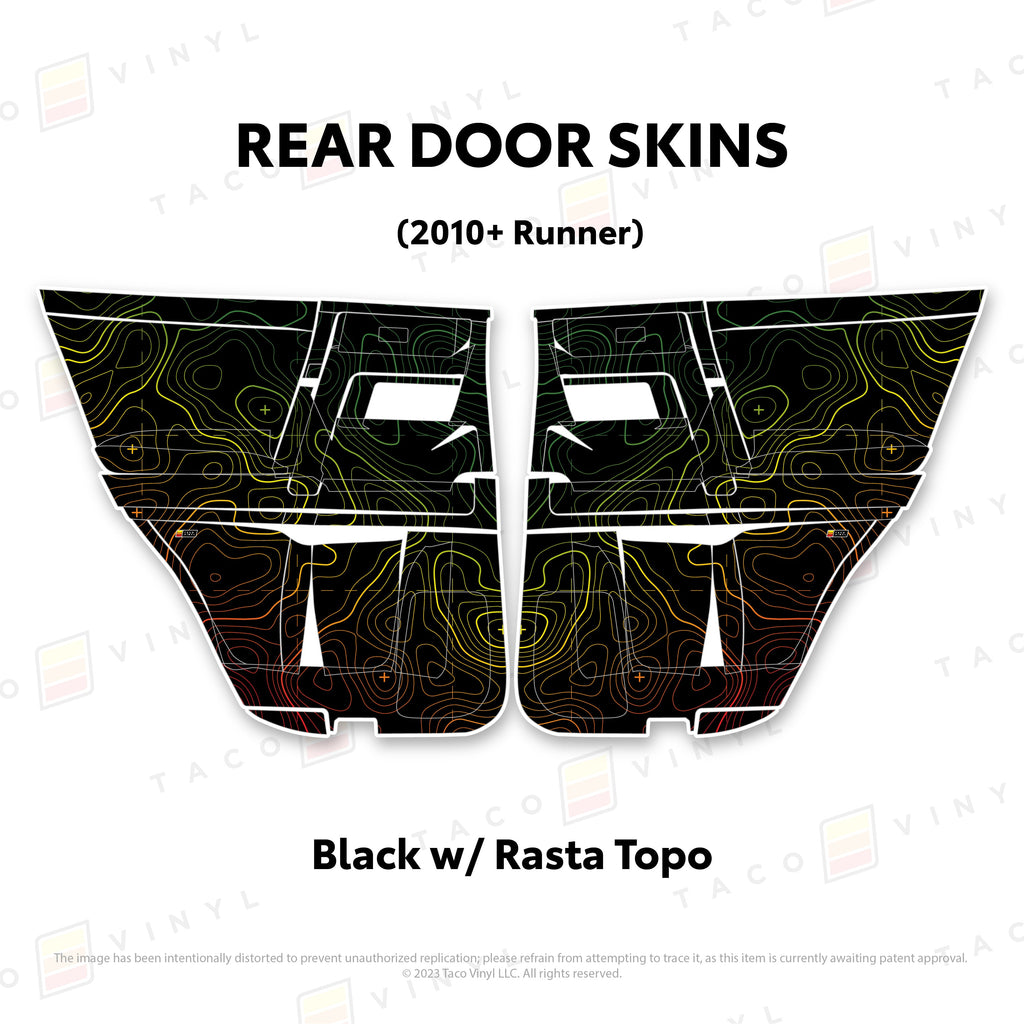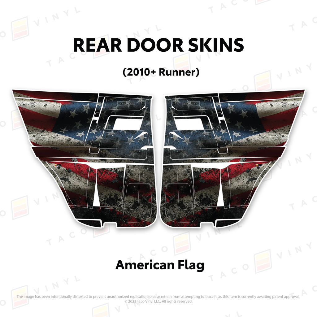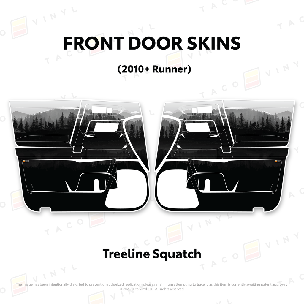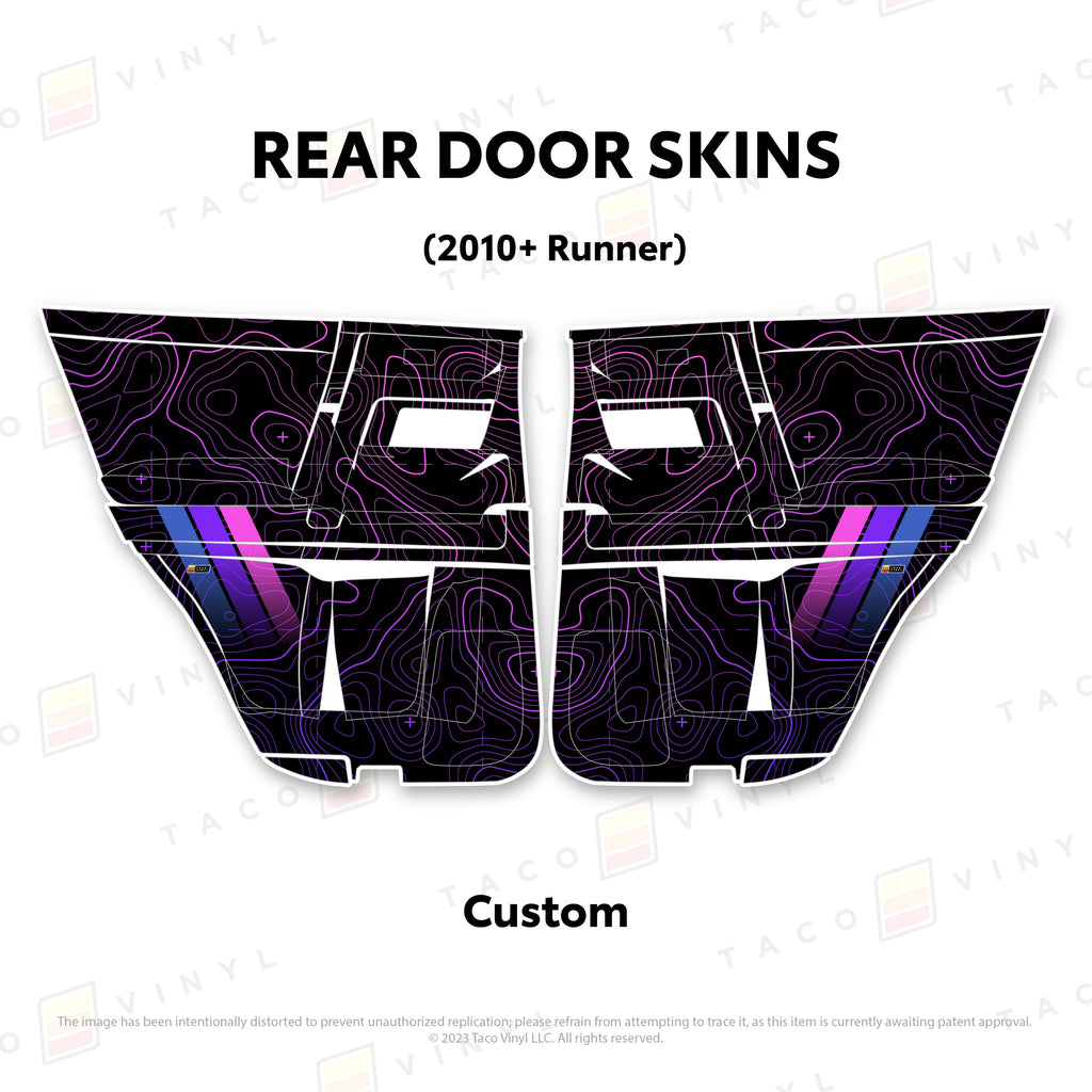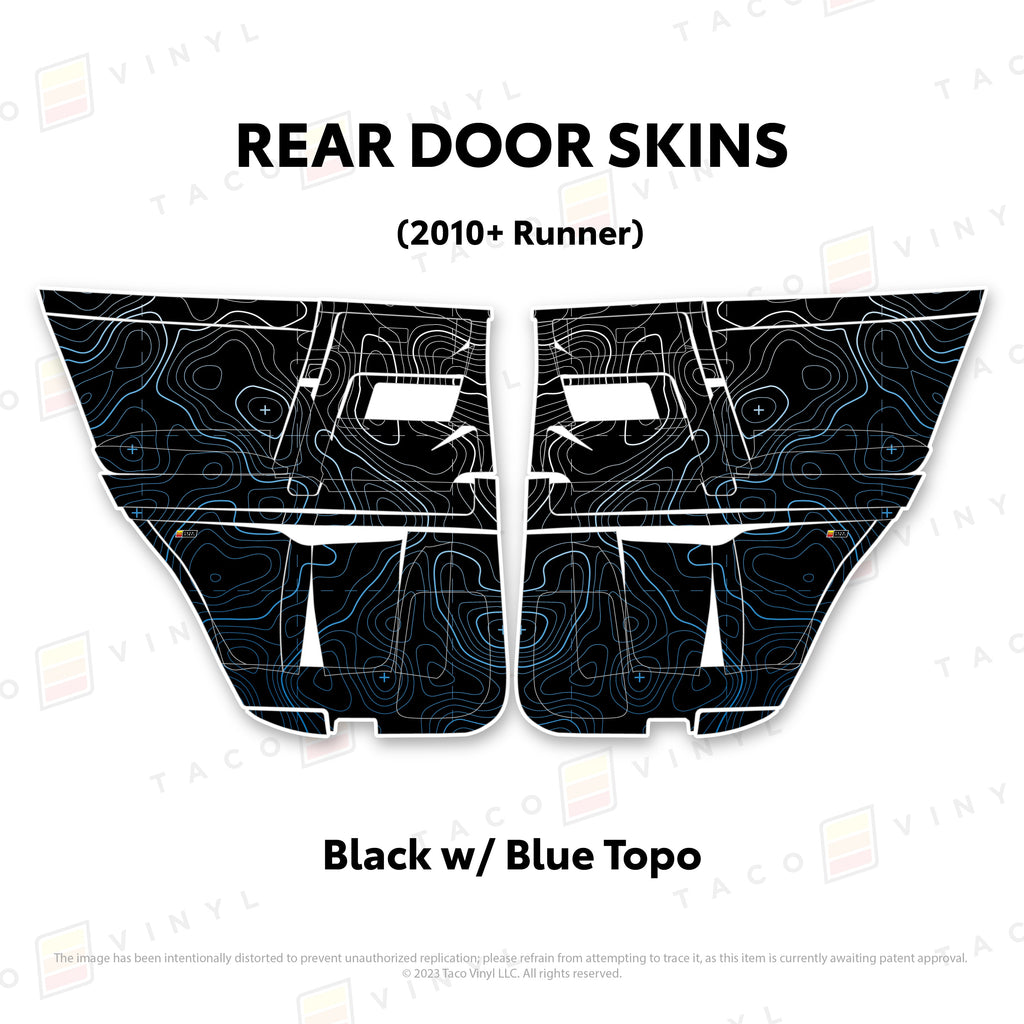 Welcome the worlds first door skins for your 5th Gen 4Runner. Taco Vinyl Door Skins for 4Runner (2010-2024) are made of the best and thickest material to get the job done. Taco Vinyl made these at first to protect against door wear and tear from your boots, tools, pets and recreational activities then discovered that they are also aesthetically appealing. Whether you plan to keep your truck forever or have it on lease, Taco Vinyl door skins will keep the door panel in great condition while also adding a cool design if you choose. Plus, the 4Runner design provides 20% more coverage than the Tacoma.