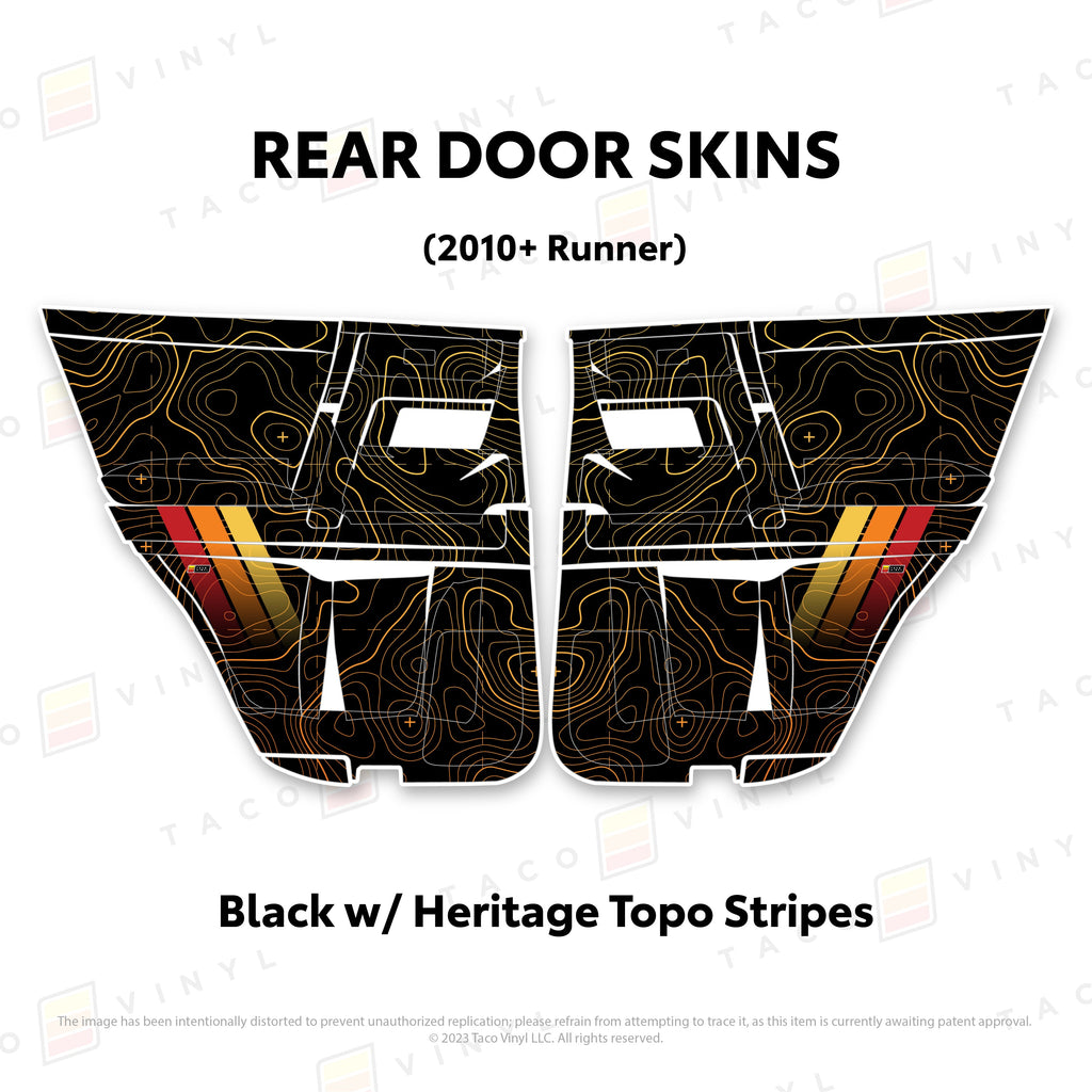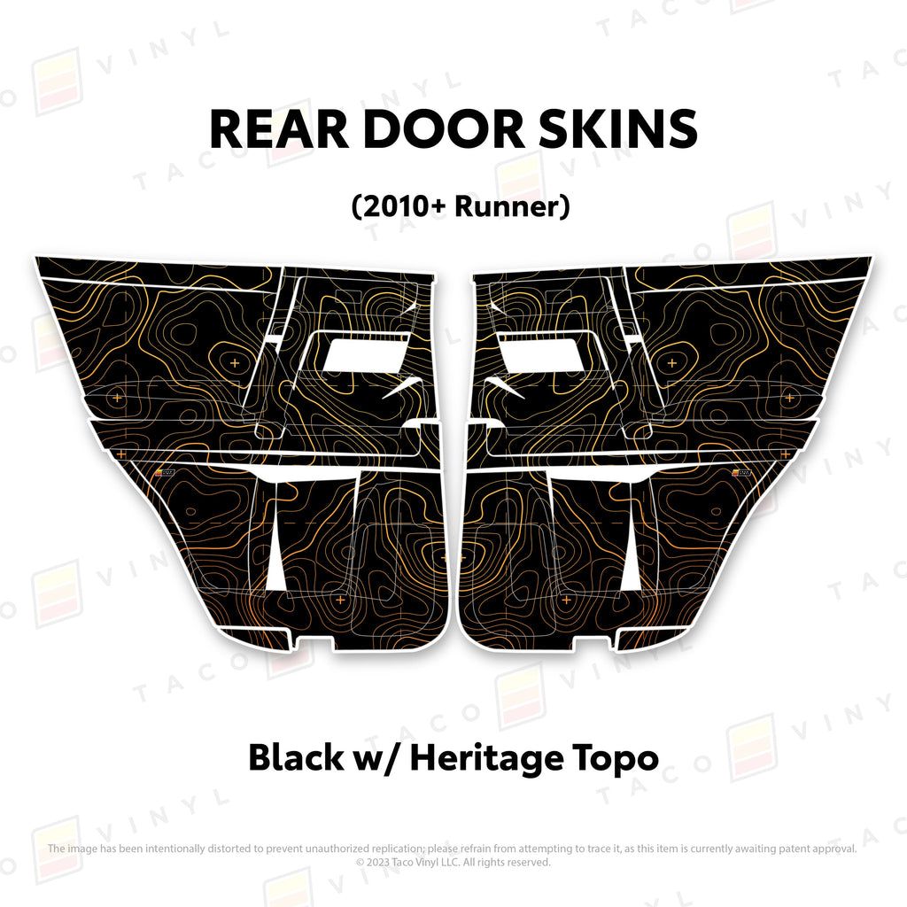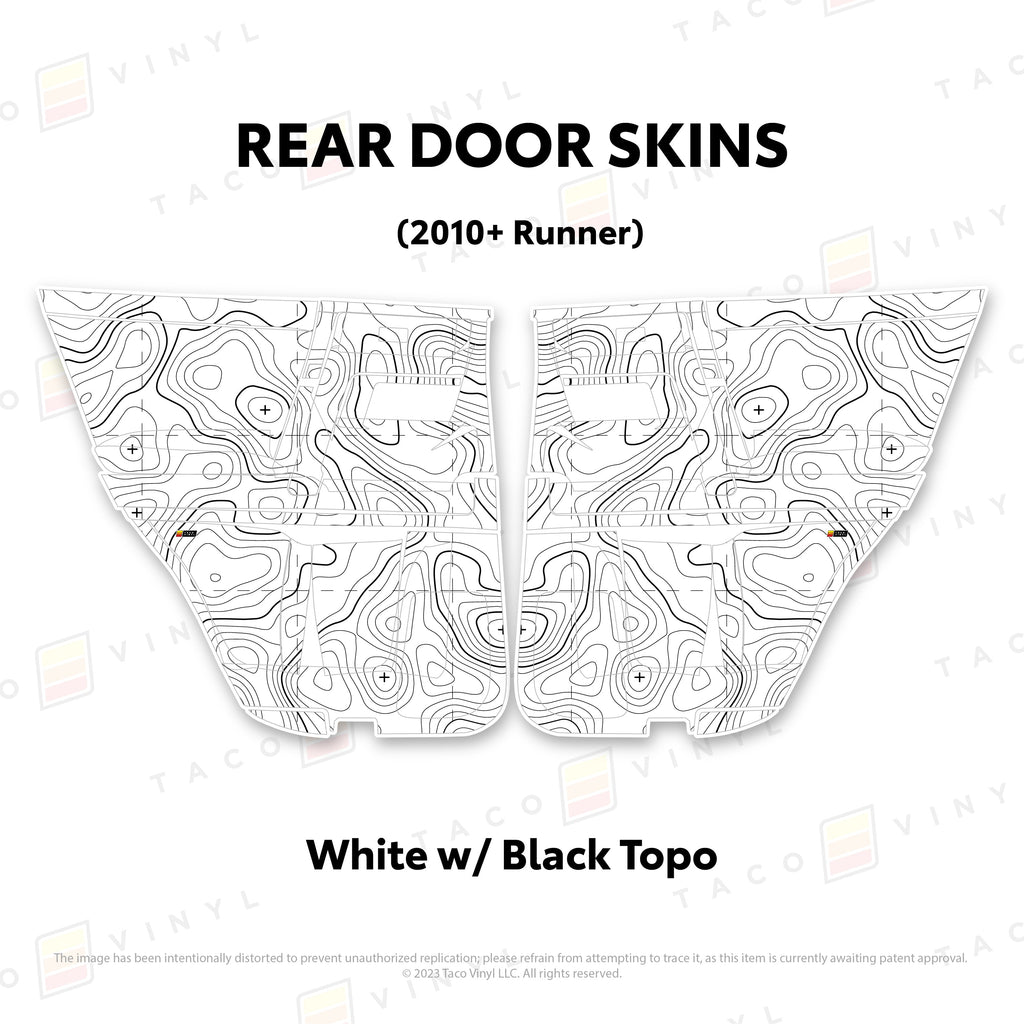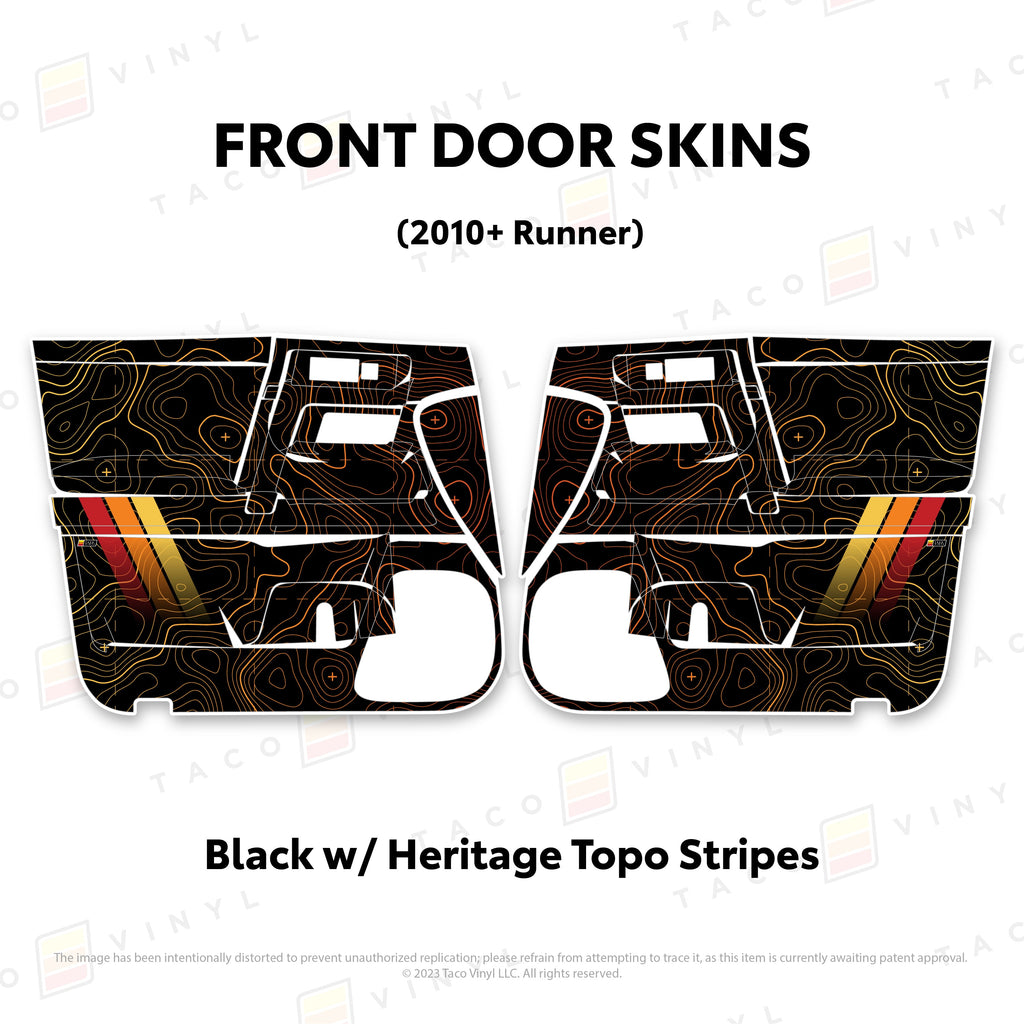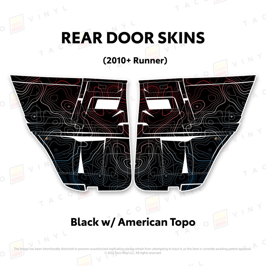 Welcome the worlds first door skins for your 5th Gen 4Runner. Taco Vinyl Door Skins for 4Runner (2010-2024) are made of the best and thickest material to get the job done. Taco Vinyl made these at first to protect against door wear and tear from your boots, tools, pets and recreational activities then discovered that they are also aesthetically appealing. Whether you plan to keep your truck forever or have it on lease, Taco Vinyl door skins will keep the door panel in great condition while also adding a cool design if you choose. Plus, the 4Runner design provides 20% more coverage than the Tacoma.