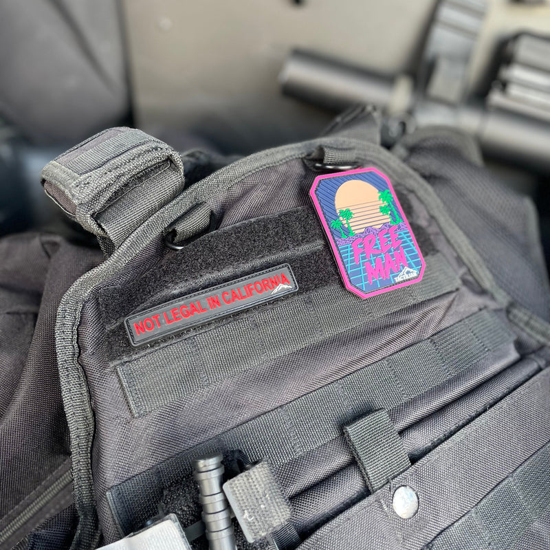 Introducing the "FREE MAN" Retro Miami PVC patch - a vibrant fusion of color and style featuring a stunning design of the rising sun, palm trees, mountains, and water. This eye-catching patch is sure to stand out with its bold and bright colors!