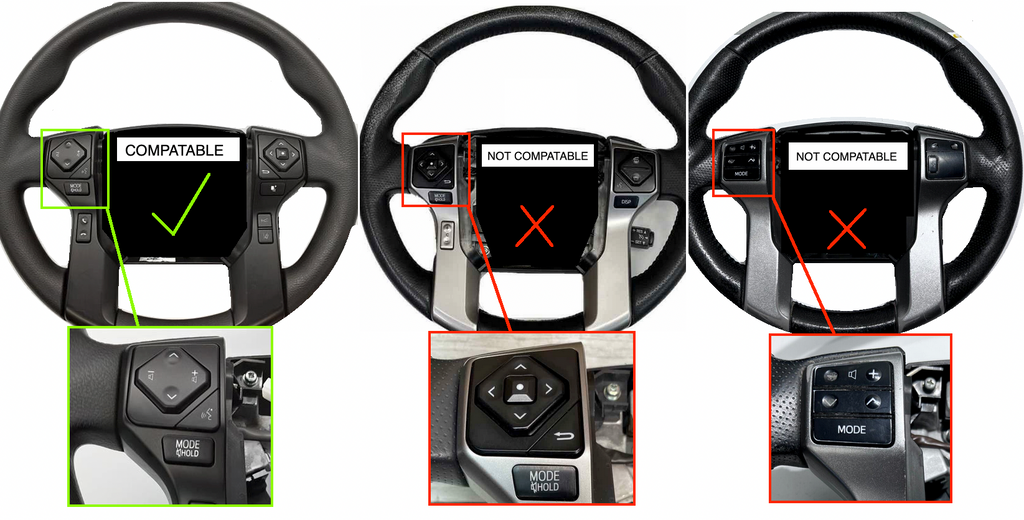 Introducing the Meso Customs Steering Wheel Control Fix kit. Finally a solution to the backwards volume buttons on your steering wheel! Have you ever wanted to turn up the song and pressed UP only to skip to the next track? For whatever reason, Toyota's engineers oriented the buttons on the steering wheel completely backwards and this kit will fix that. Now the VOLUME control buttons are UP/DOWN and the the TRACK forward/back is LEFT/RIGHT. This kit is 100% Plug and Play(5-10 minute installation) and includes a New Injection molded button, New PCB board, and converter harness(for some older applications). All other buttons; MODE/ANSWER/HANGUP/MENU/ETC will stay the same and are not affected.