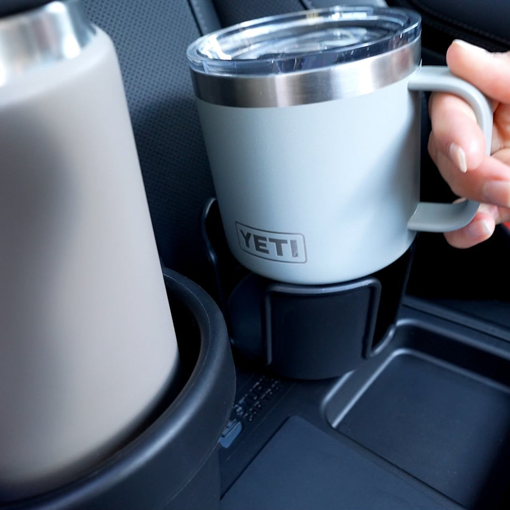 XL Dual Cup Holders: Holds mugs, bottles, and tumblers up to 4 inches wide. Never worry about spills again.