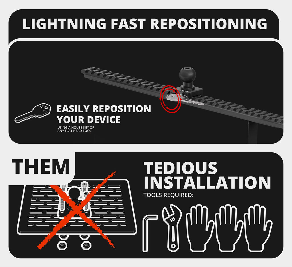 Some dashboard brackets on the market are designed with a short width. The problem with that platform is that they require the use of long arms to place devices in their appropriate position for the driver and passenger. At Tackform, we’ve developed a full-width bracket that is wide enough to accommodate ball mounts at the furthest ends of the bracket. This design allows you to use much shorter arms to mount your devices effectively.
