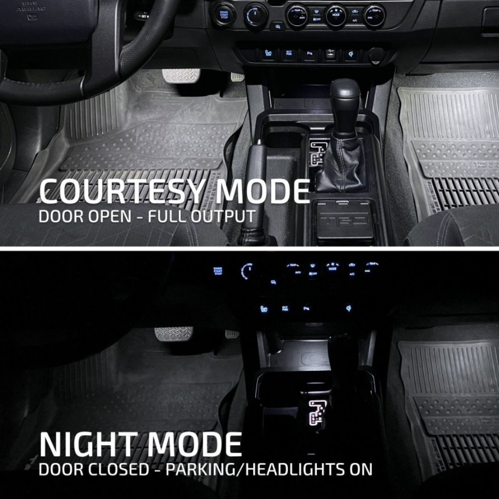 Upgrade your interior experience with the VLEDS Dual Output LED Front Footwell Kit for Tacoma (2016-2023). Enhance comfort and spaciousness while achieving a sleek, luxurious look. Illuminate every corner of the interior of your 3rd Gen Tacoma with ease using both the front and rear add-on footwell kits from VLEDS.
