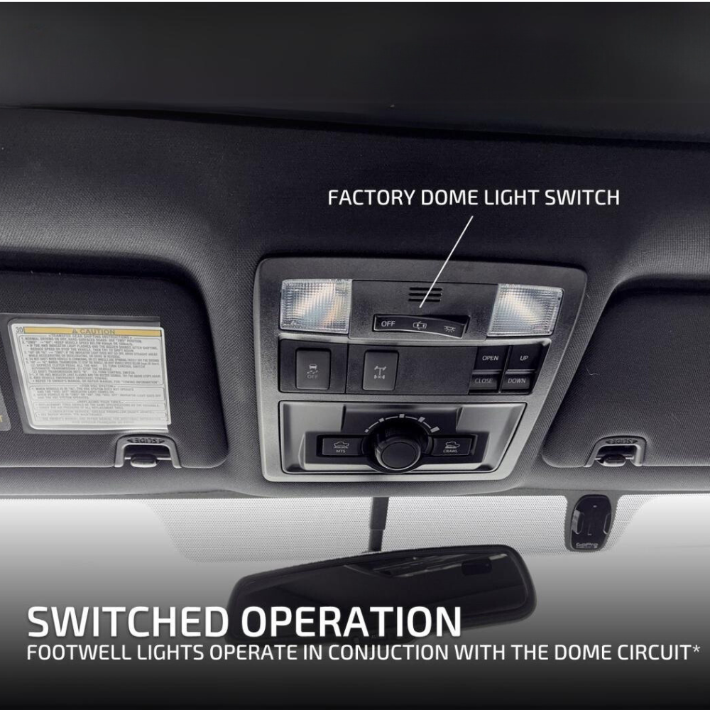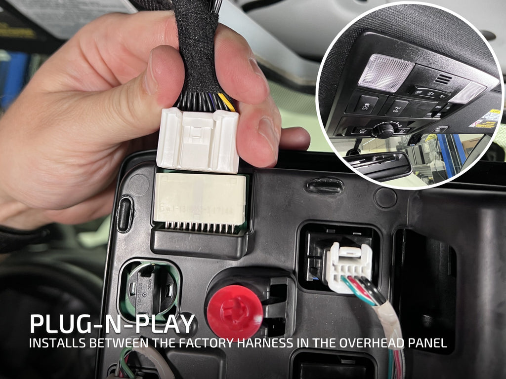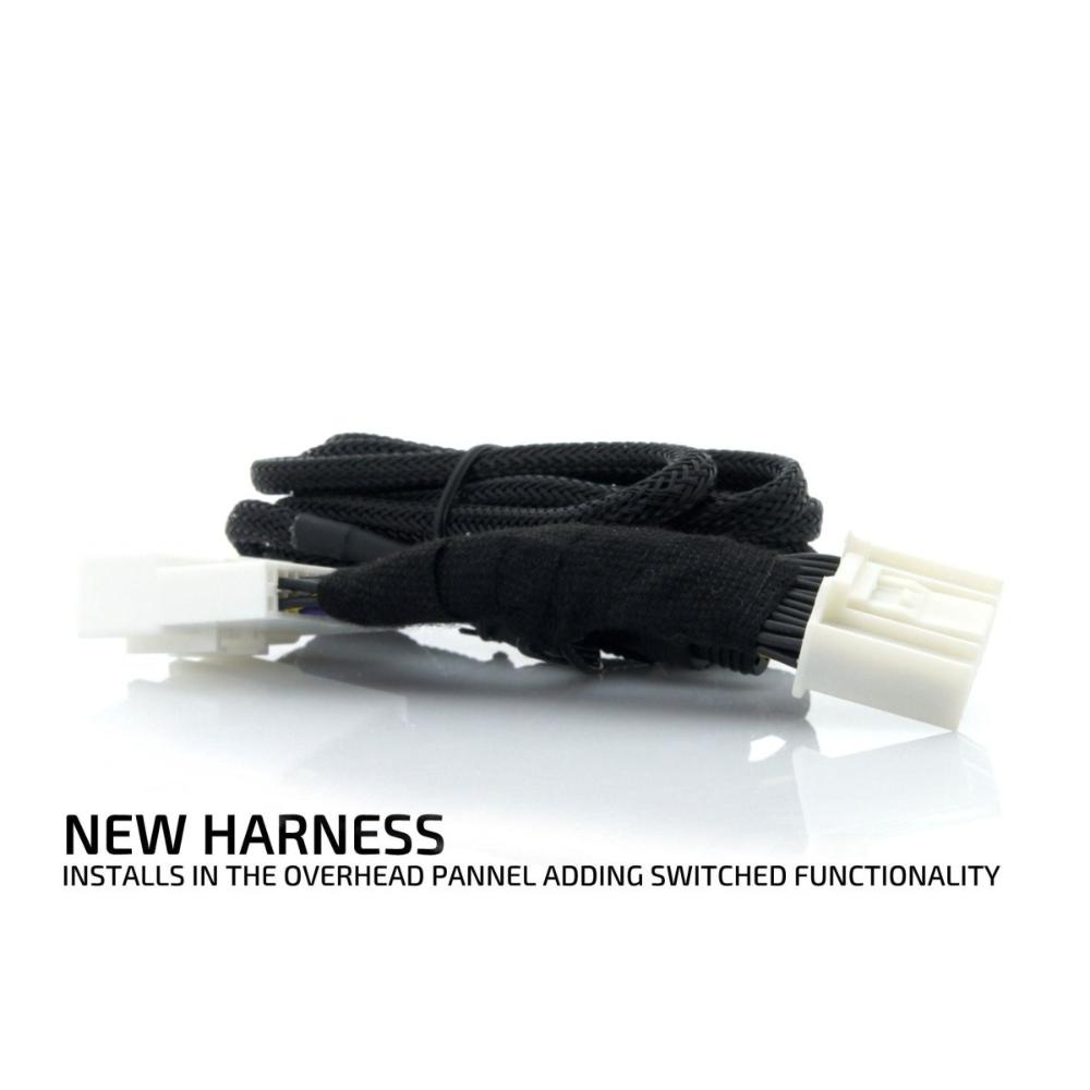 New Harness Like the previous version, there is no splicing or tapping into your factory wires. The new, easier-to-install OEM-style harness is now installed between the factory harness and the overhead panel assembly. This harness enables paralleled functionality by combining footwell and dome lights with the factory overhead light switch.